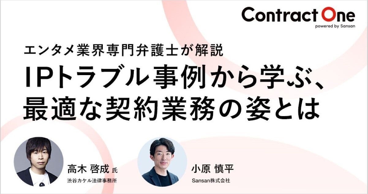 本セミナーでは、エンターテインメント業界における幅広いトラブルに対応する、渋谷カケル法律事務所の代表弁護士である高木啓成氏より、権利活用の最新トレンドや契約における注意点などを解説します。また、当社Contract One Unitの小原慎平より、契約情報のデータ化・活用の実現方法と事例をご紹介します。