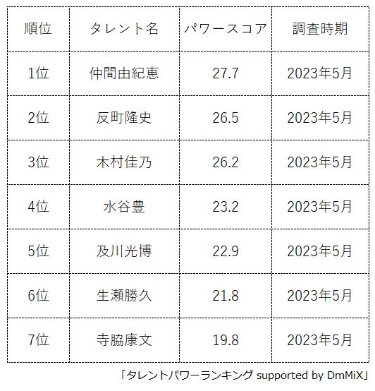 本ランキングは、2023年5月度に実施したタレント調査データ(一部過去実施データ)を利用し、タイトルに応じてランキング形式でまとめたものです。