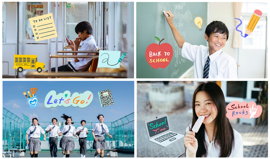 新学期の始まりを楽しくカラフルに彩る、文房具、本、地球儀など、遊び心あふれるデザイン15種類のステッカーです。