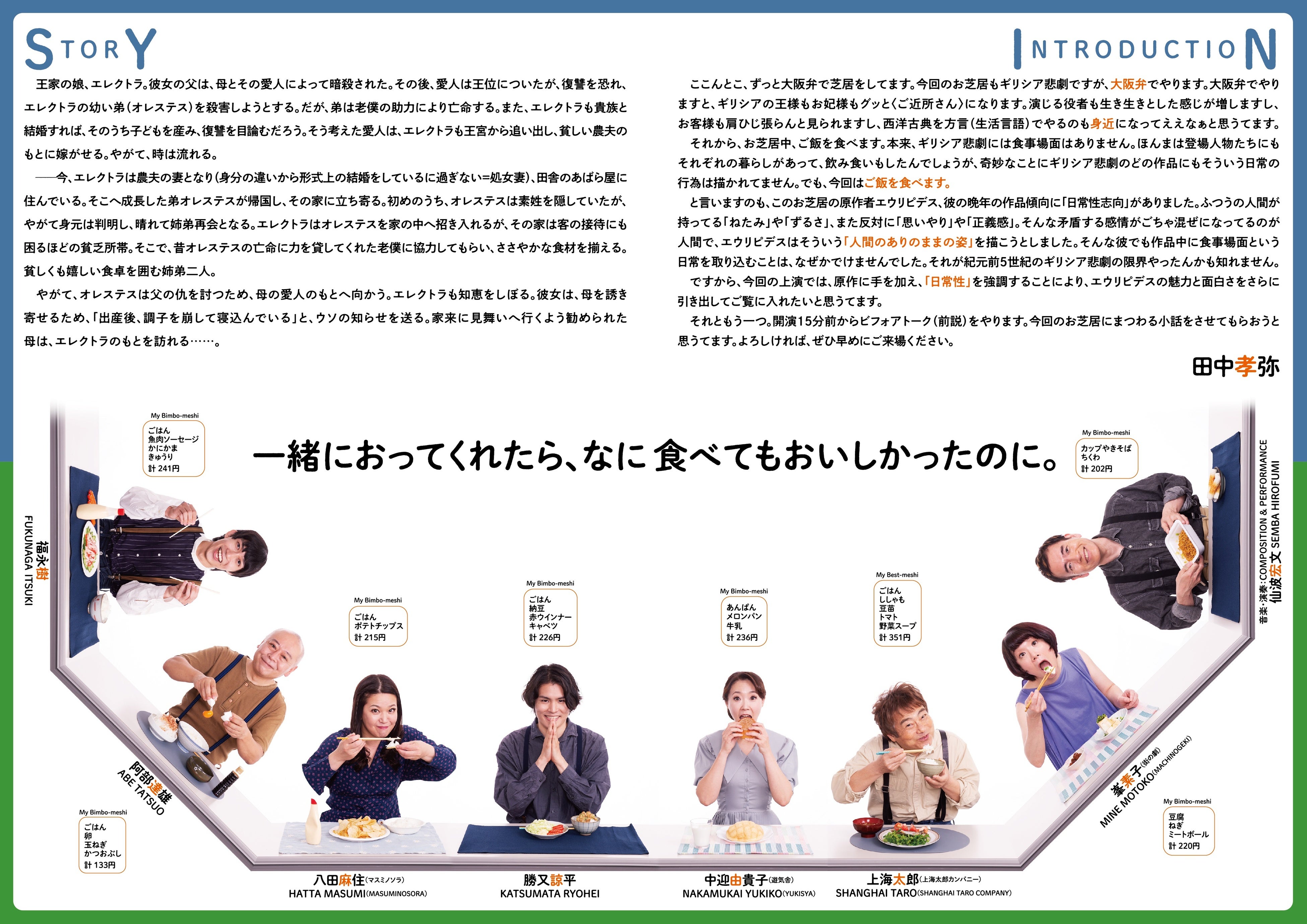 それから、お芝居中、ご飯を食べます。本来、ギリシア悲劇には食事場面はありません。ほんまは登場人物たちにもそれぞれの暮らしがあって、飲み食いもしたんでしょうが、奇妙なことにギリシア悲劇のどの作品にもそういう日常の行為は描かれてません。でも、今回はご飯を食べます。