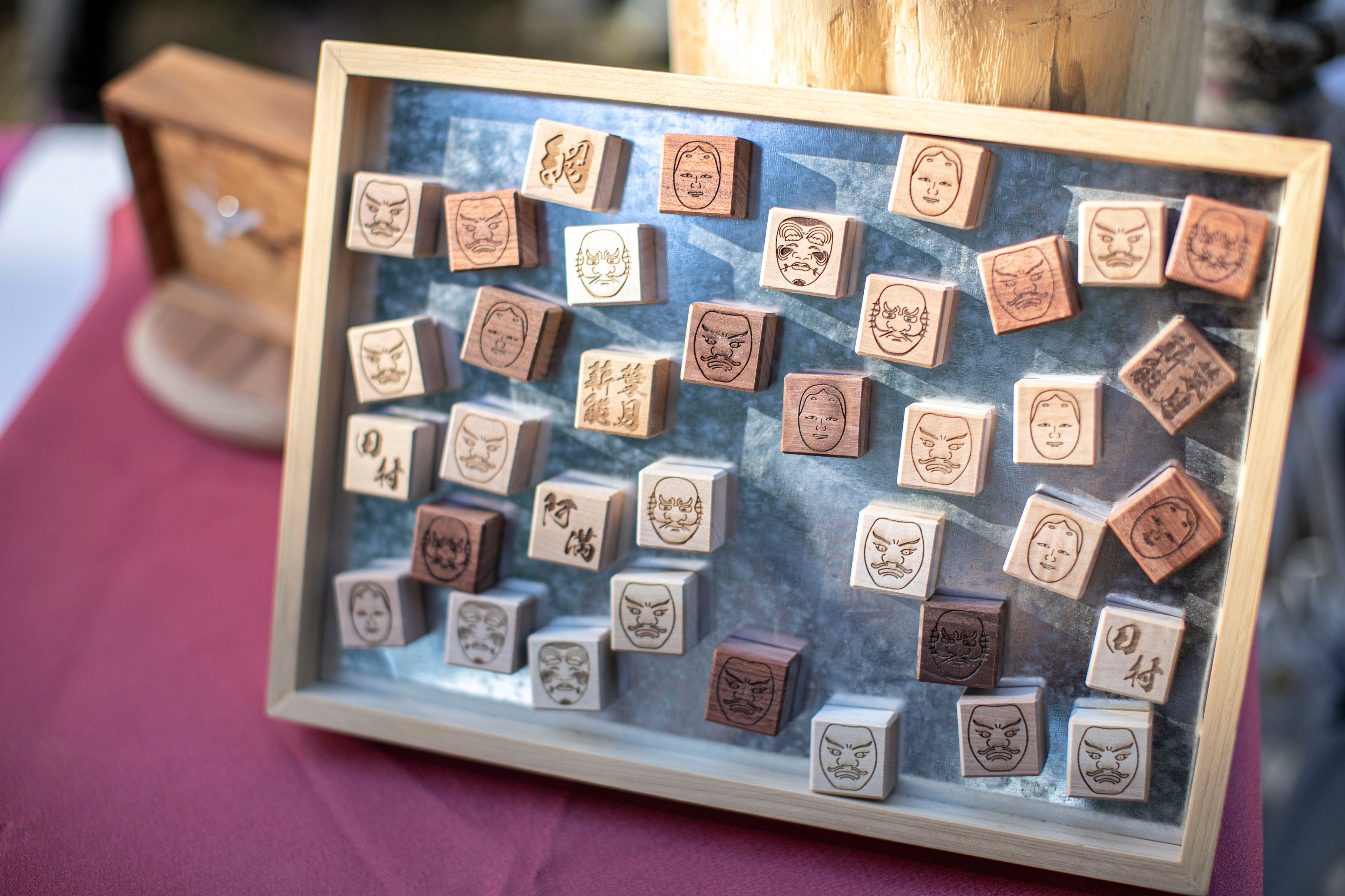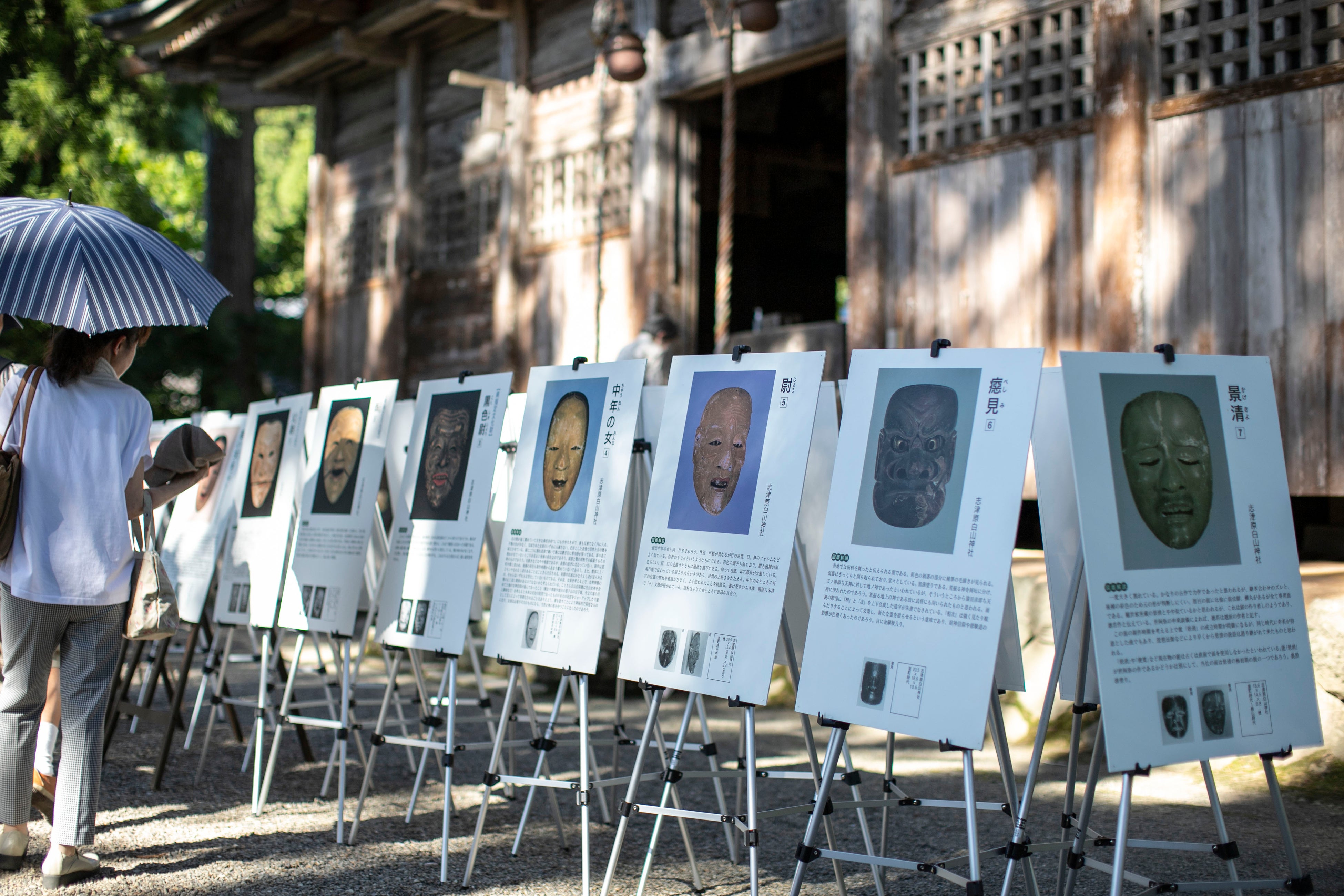 先人と地域を敬う象徴として大切に保管され、普段は一般公開していない室町期からの貴重な古面41点を、須波阿湏疑神社拝殿前にて、パネルにて展示しました。来場者は貴重な古面写真を熱心に観覧しました。
