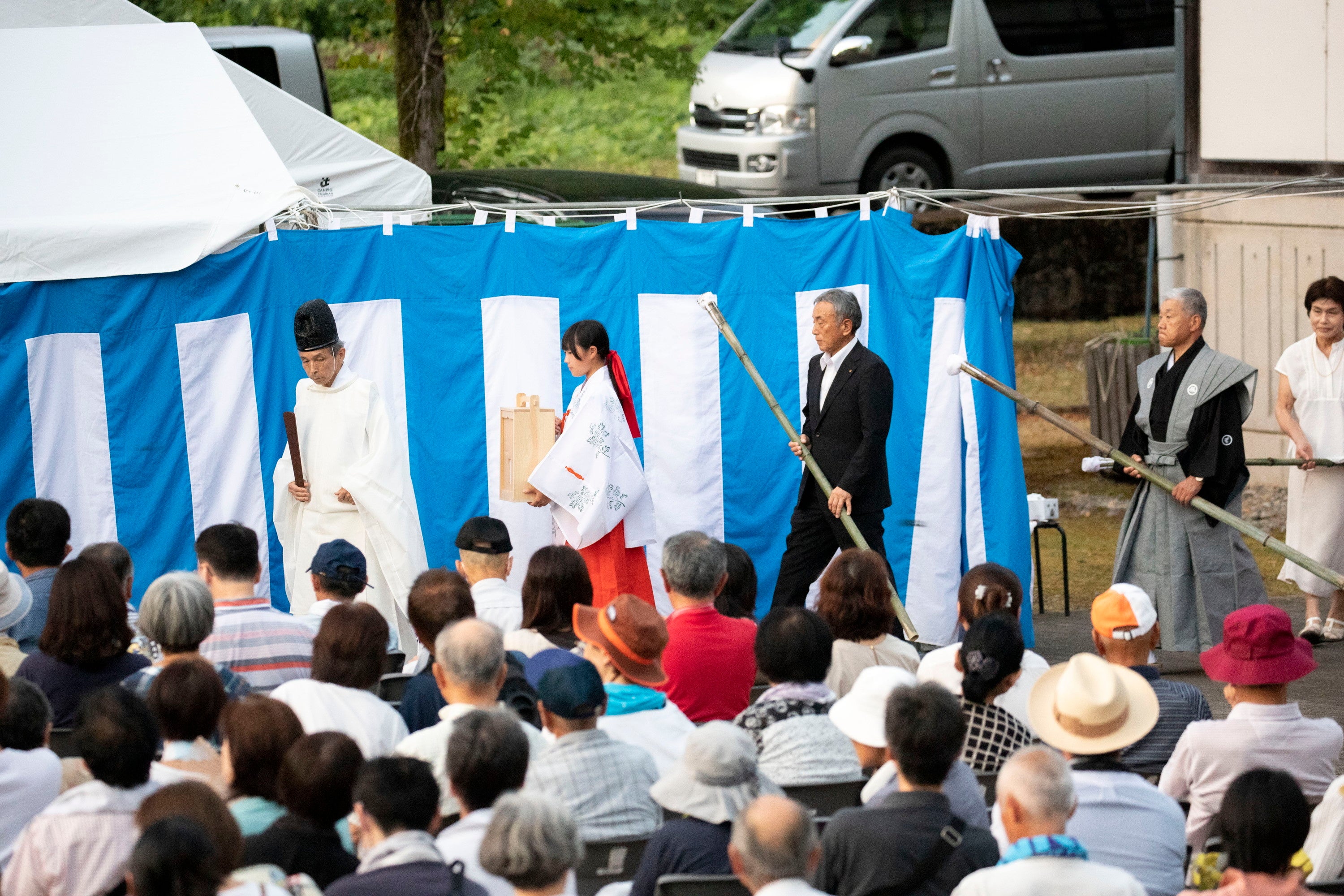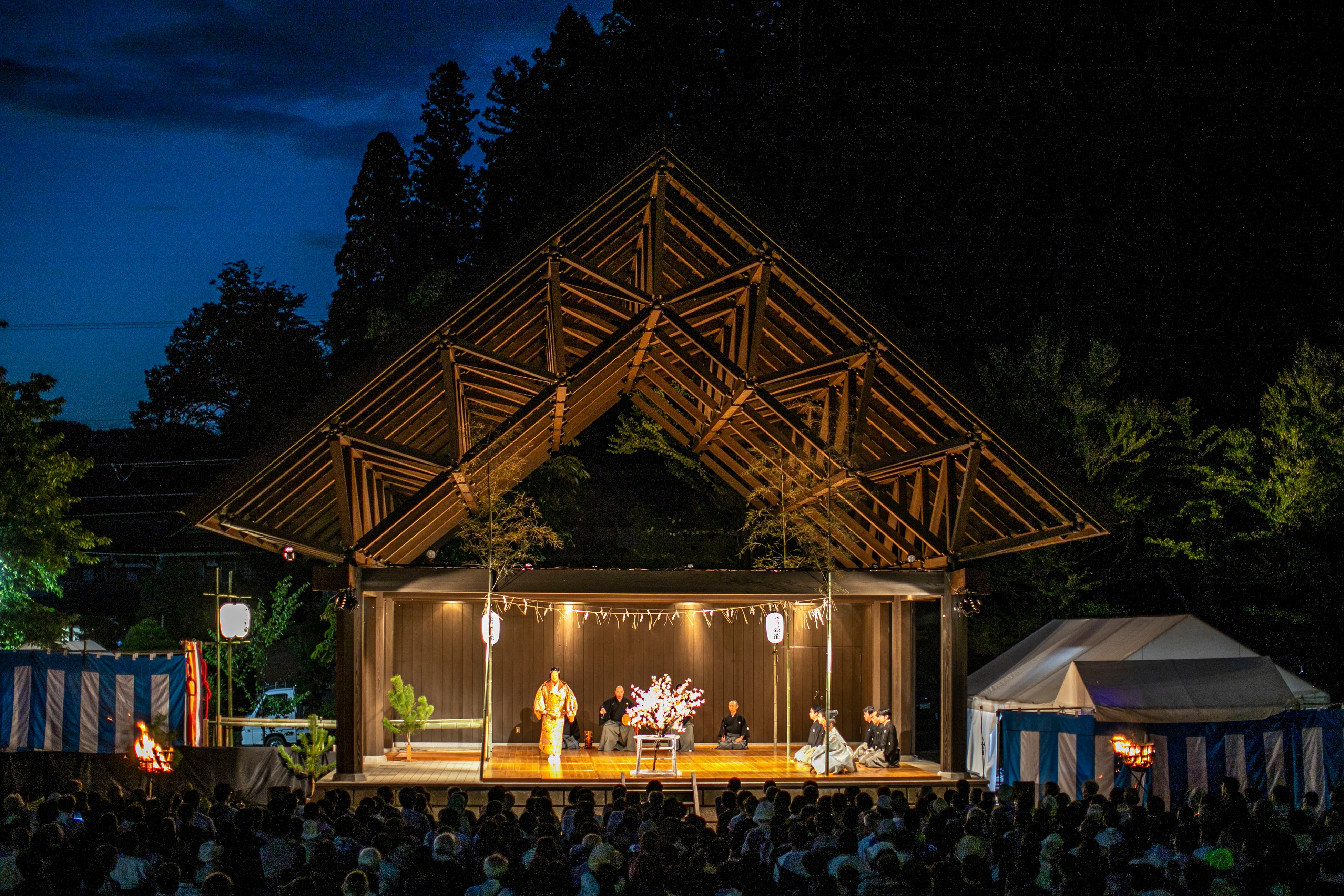 会場には池田町の食や木の魅力を楽しめる物販店のほか、茶道の野点席も設けられ、大いににぎわいました。夜は町民によって廃油から作られた約1000個のエコキャンドルの灯りが参道を彩り、終演時に打ち上げられた花火には歓声が上がりました。池田町の夏の一夜は幻想的で厳かな雰囲気の中、日本の伝統文化に触れる人々の温かい笑顔に包まれました。
