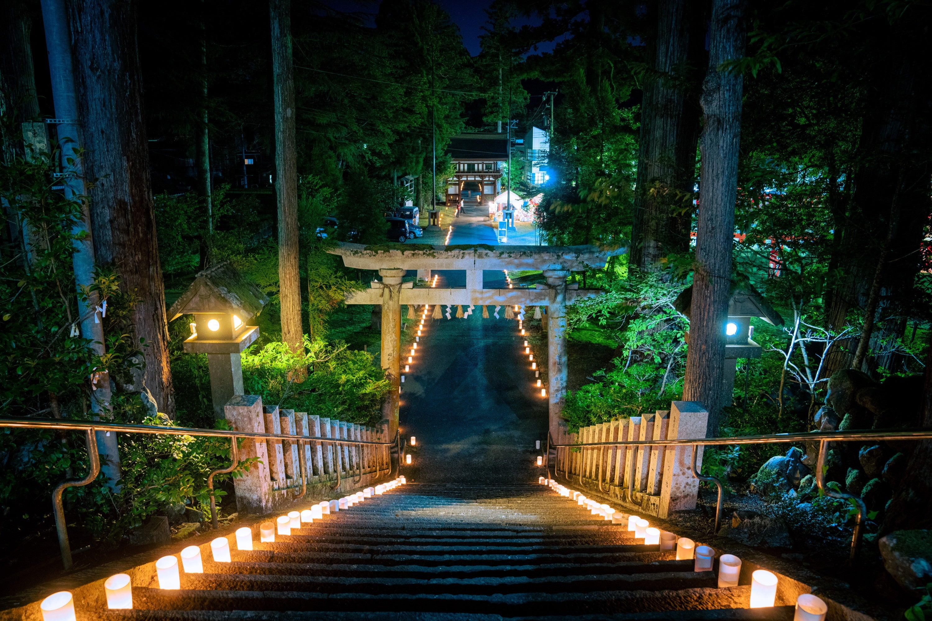 池田町の青年団をはじめとする町民たちが3日かけて作成した約1000個のエコキャンドルが、神社参道を照らしました。エコキャンドル作りには池田町で集められた廃油が使用されており、2005年から環境活動の一つとして実施しています。 また終了後、約10分の打ち上げ花火が夏の夜空を彩りました。