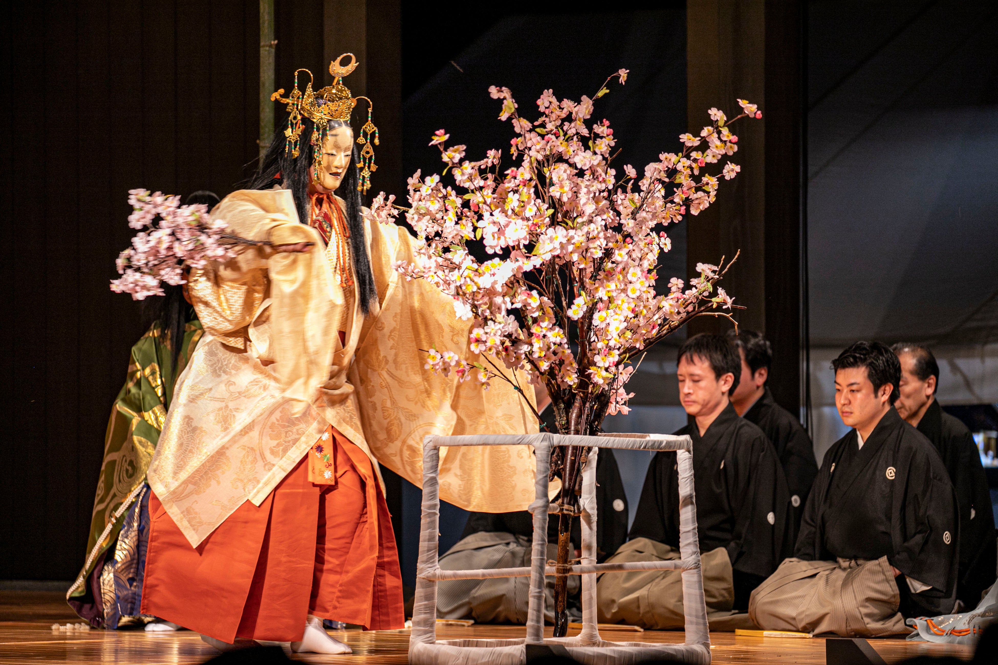 桜の咲き誇る頃、風雅を愛する「中納言」は延命の神「泰山府君」に桜の延命を祈ります。そこに「天女」が現れ、桜を手折り昇天しますが、「泰山府君」が呼び戻し、桜を元に戻させ、さらに大いに神通力をふるって、桜の命を延ばします。人間国宝に認定された金剛永謹さんと宝生欣哉さんが「泰山府君」と「中納言」を演じ、舞台で繰り広げられる優美で豪快な舞に大きな拍手が送られました。