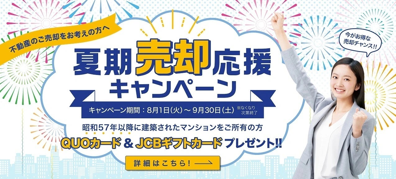 なお、9月30日までマンションのご売却予定の方にQUOカードやJCBギフトカードをプレゼントする夏期売却応援キャンペーンを実施中です。