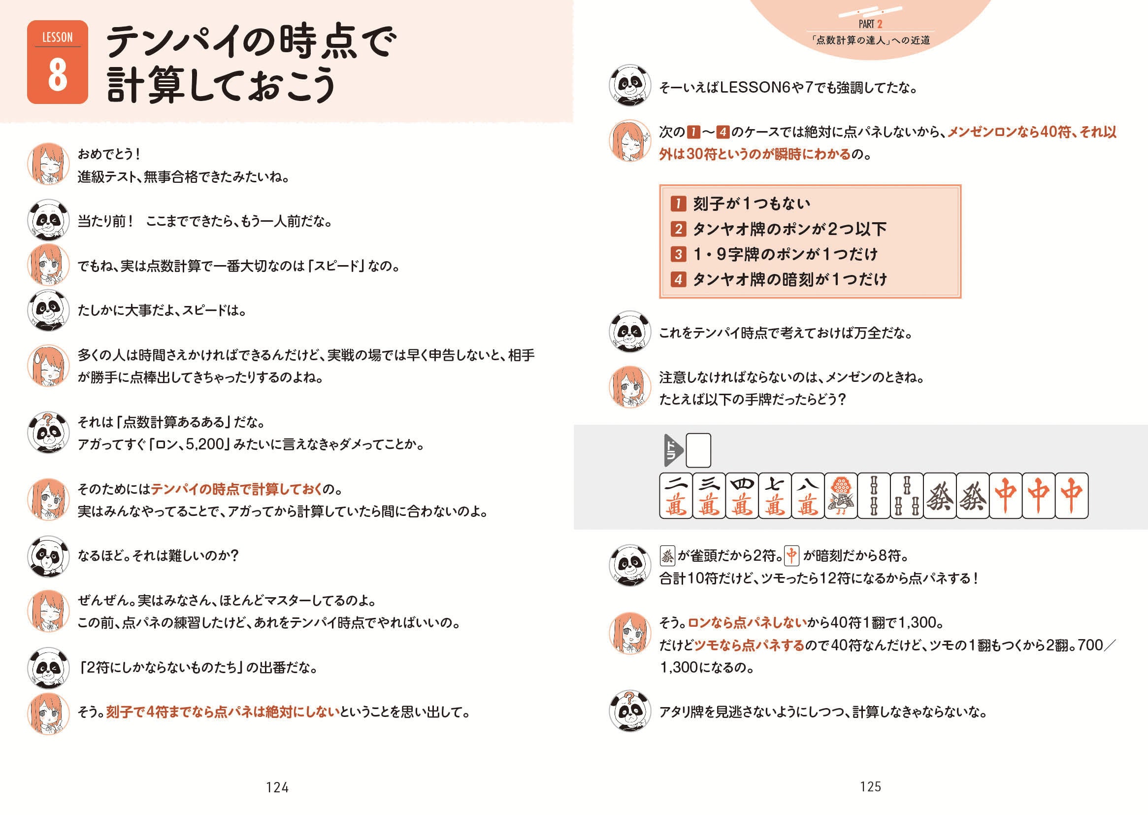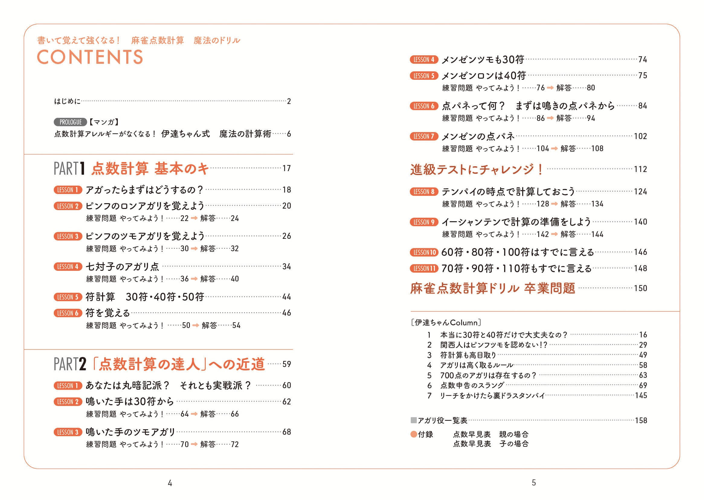 「そもそも符計算って何?」「点数早見表を覚えるのがしんどい」「頭では符計算ができても実戦だとスピードが追いつけない」…こうした理由で点数計算を諦めてきた方に、ぜひ試してみてほしいこの書籍。点数早見表を覚える必要はなく、「①ピンフのロン ②ピンフのツモ ③七対子の点数 を覚えるだけで8割の計算ができる!」というシンプルさが「伊達ちゃん式」のスゴイところであり、よく出るアガリの形の問題をくり返し解いて自信をつけていく書き込み式ドリルです。