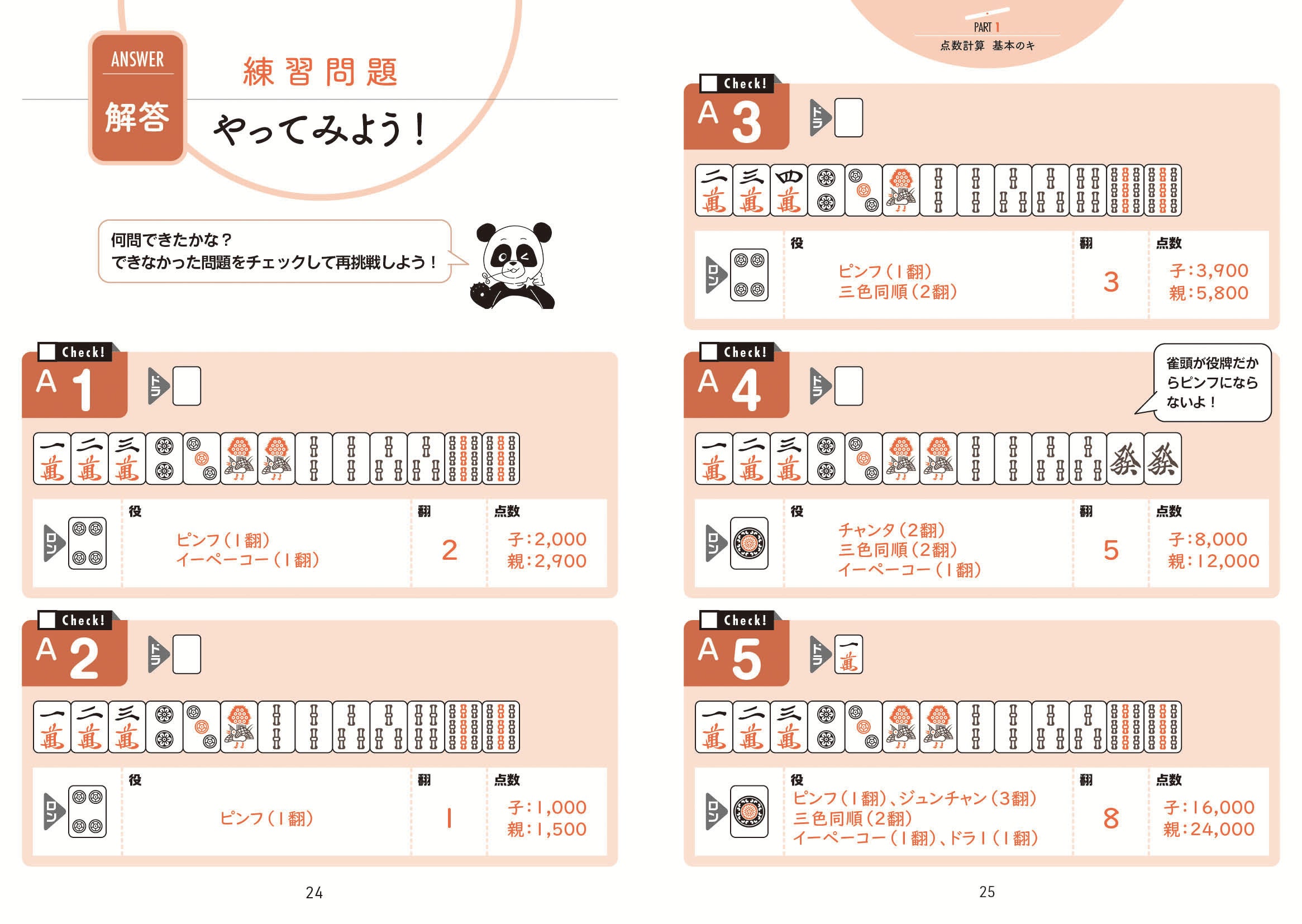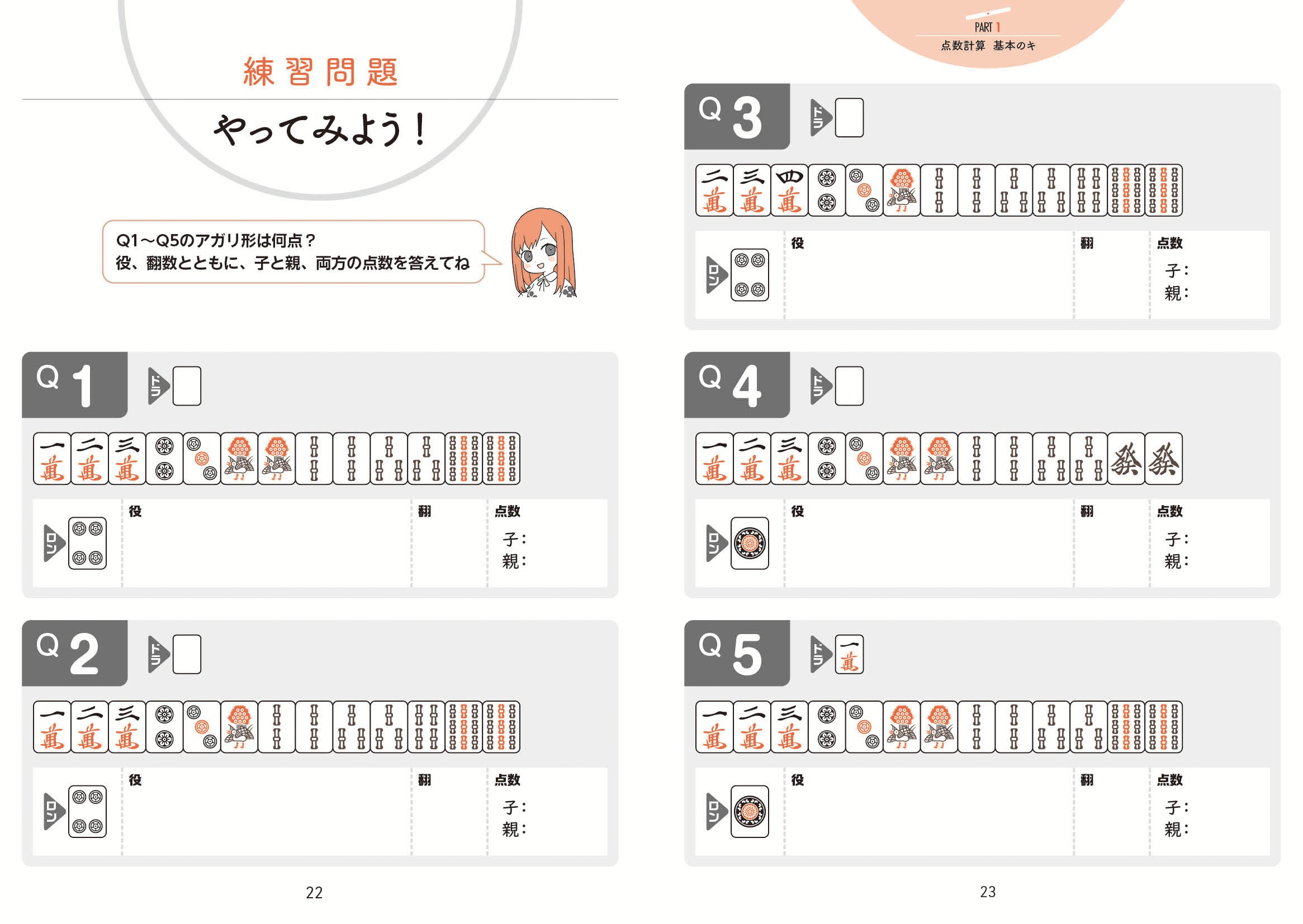 ひたすら書いて、点数計算脳が刺激されると実戦でも不思議と速く正確にイメージができるようになり、自信が身につきます。段々とできるようになったら、テンパイ時やイーシャンテン時からの計算の仕方など、中~上級者向けの問題にも取り組んでください。一冊終える頃には、あなたもプロ雀士顔負けの点数計算の名人に!