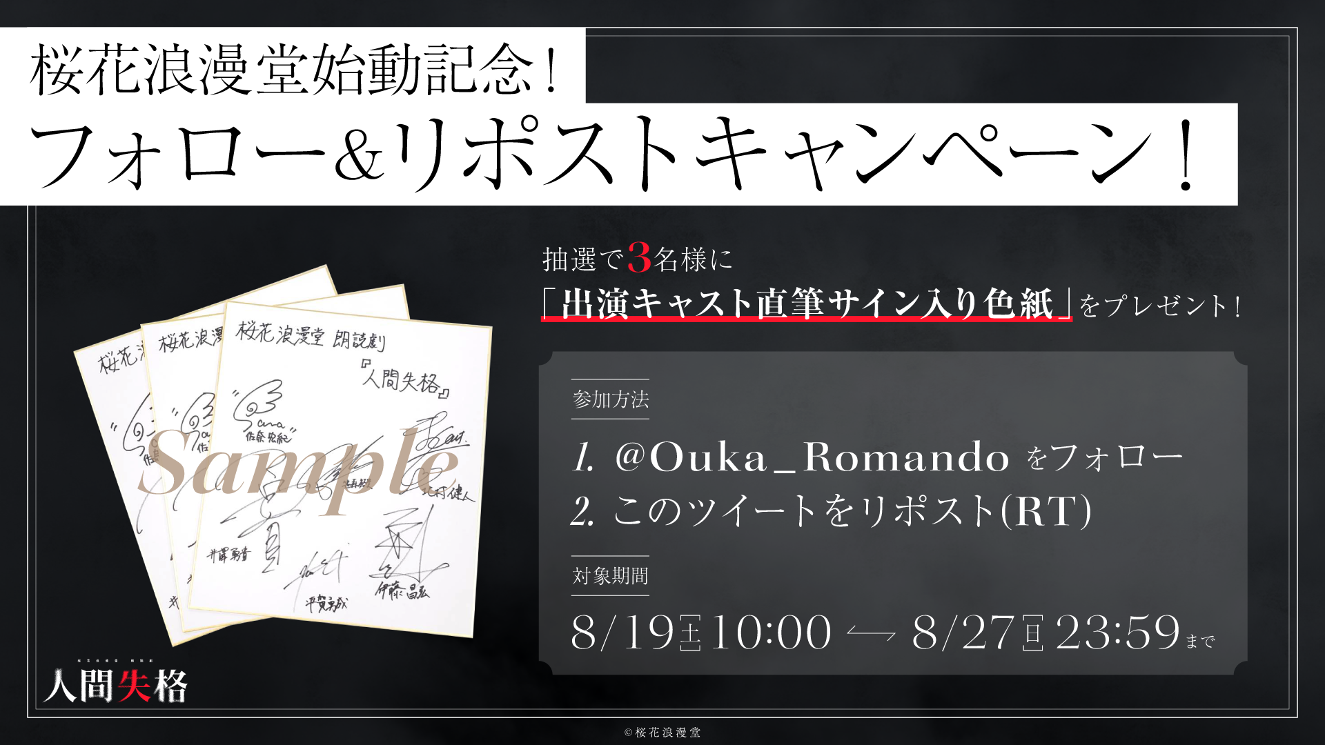 桜花浪漫堂 朗読劇『人間失格』のメインビジュアルを解禁いたしました。さらに桜花浪漫堂の始動を記念してSNSキャンペーンの実施が決定いたしました。