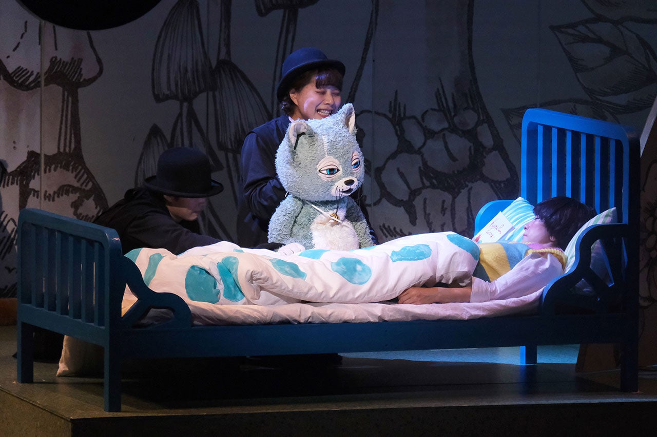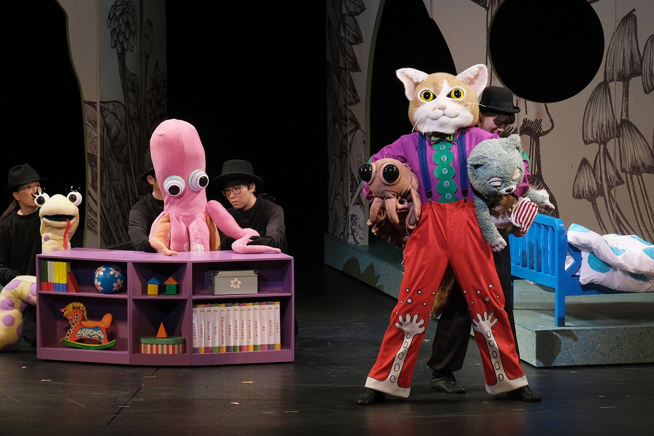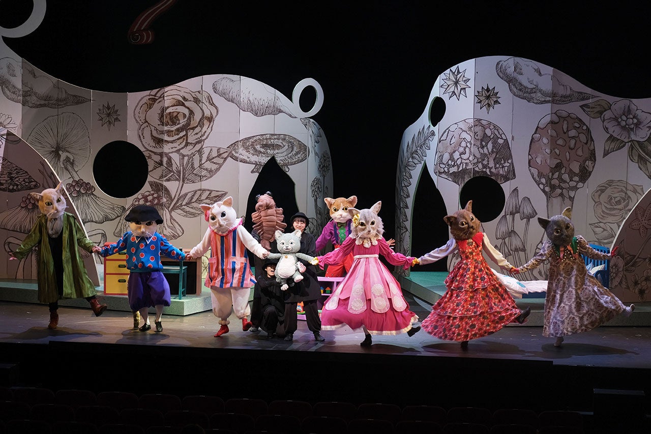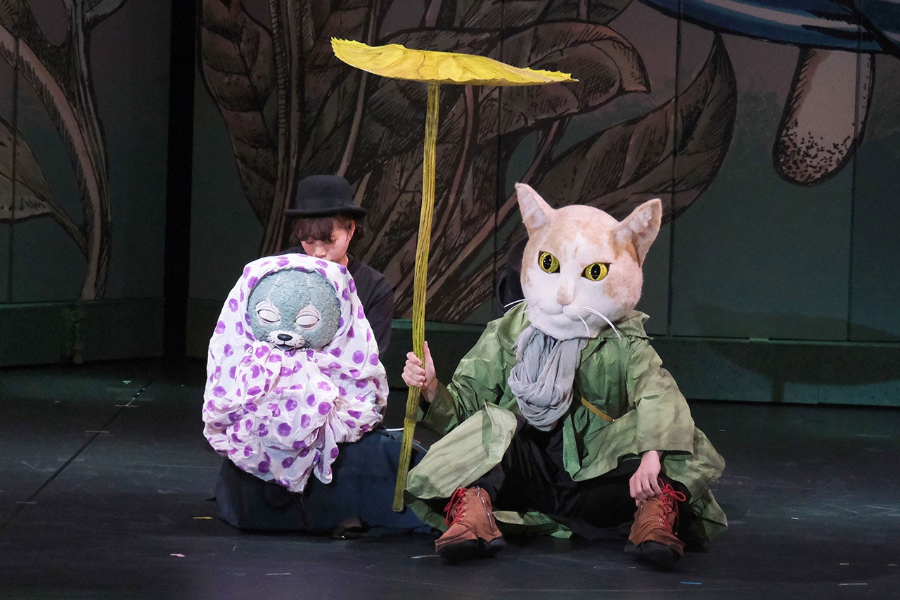 絵本から飛び出てきたようなファンタジックな舞台美術が広がる中、ニャンコやアノマロなどの表情豊かな人形たちと、ダンサー扮する愛嬌たっぷりの猫たちが、心温まるセリフや歌と踊りで、優しくも切ない世界を描き出しています。