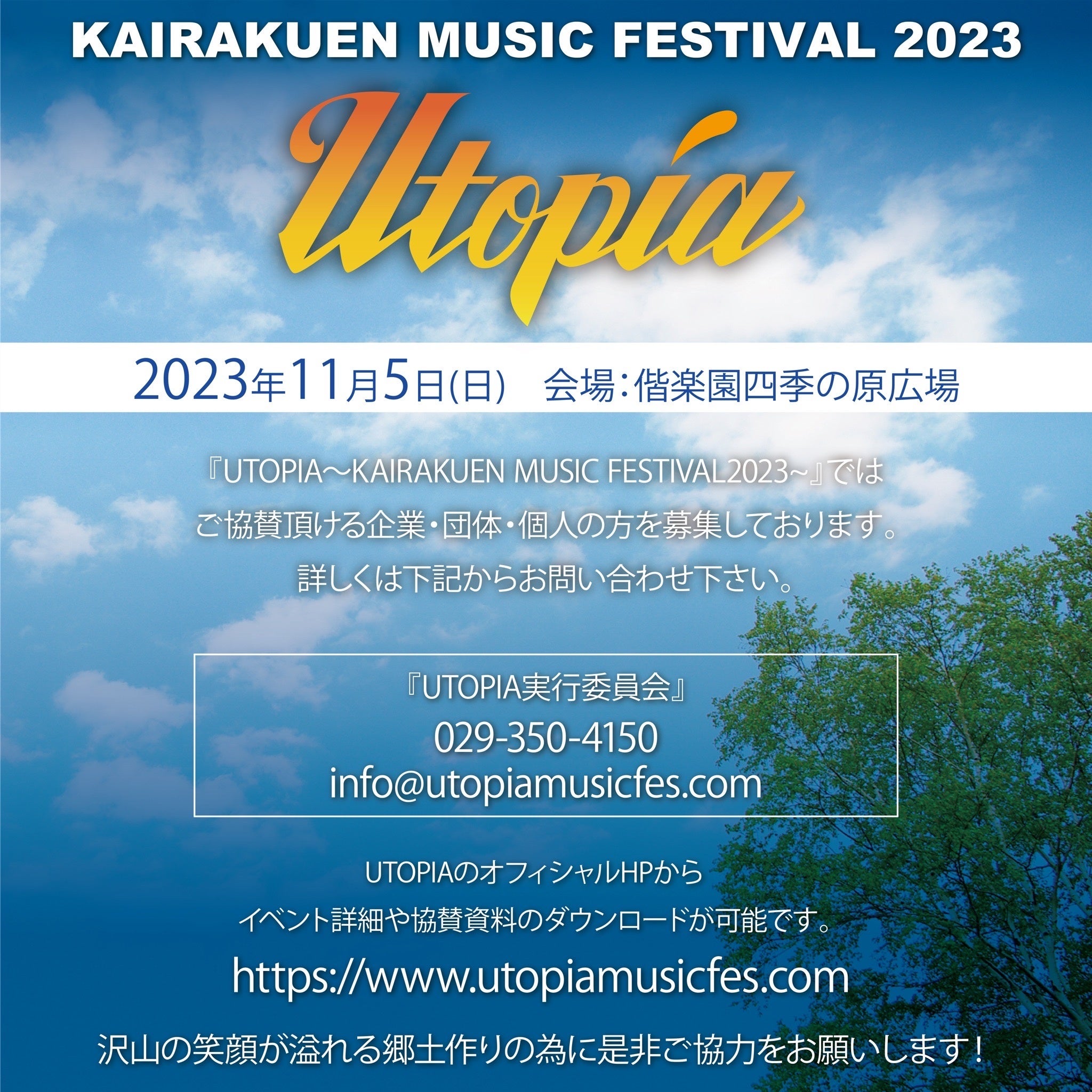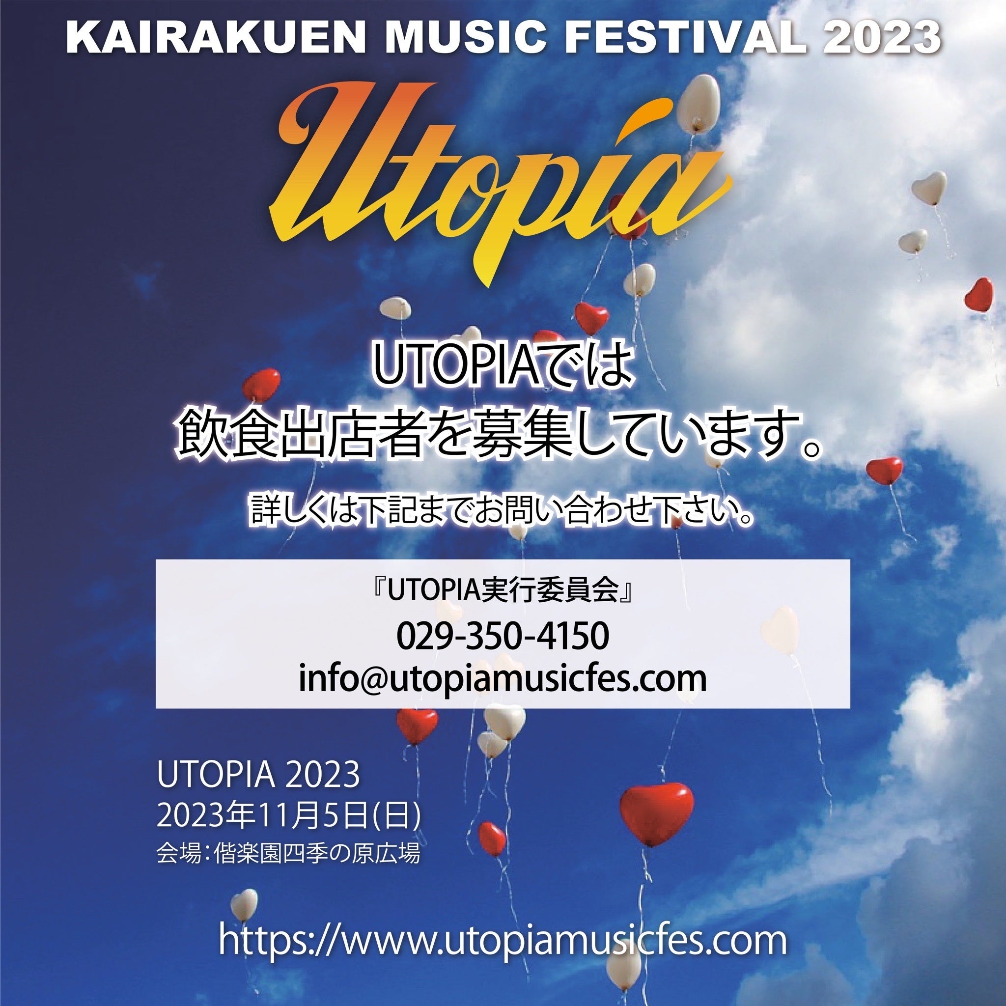 偕楽園音楽祭が新たにUTOPIAと名前を変え、2023年11月5日(日)に、茨城県水戸市の偕楽園四季の原広場特設会場にて音楽フェスを開催致します。国内HIP HOPアーティストが多数出演し、多店舗の飲食ブースが出店するフェスになります。