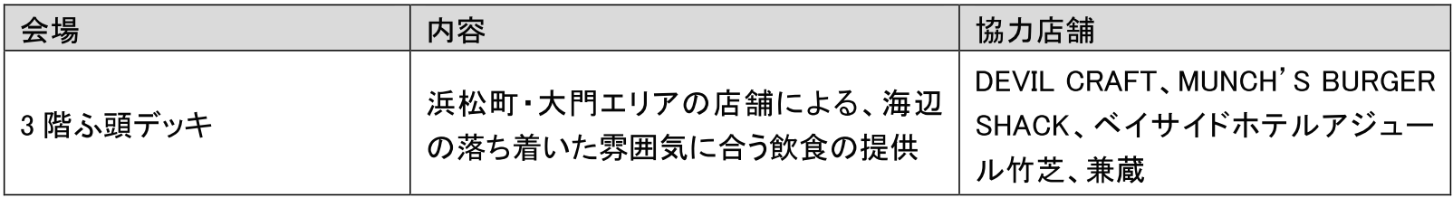 開催期間中は、竹芝エリアの飲食店舗が提供する多彩なメニューと、浜松町・大門エリアのビアレストランが提供するクラフトビールなどをお楽しみいただきます。