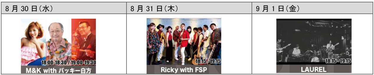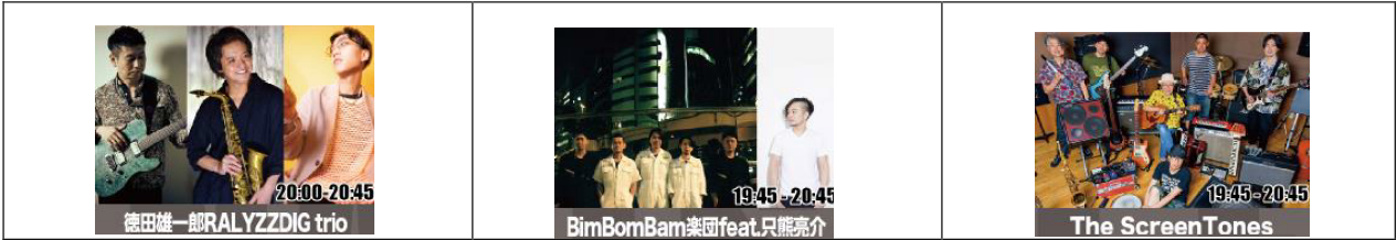 8月30日(水)と31日(木)の2日間、18時~21時に東京ポートシティ竹芝3階グリーンプラザにステージを設置いたします。演奏活動はもちろん、各種SNSやYouTube等でも活躍する幅広いジャンルのアーティスト5組の演奏をお楽しみください。