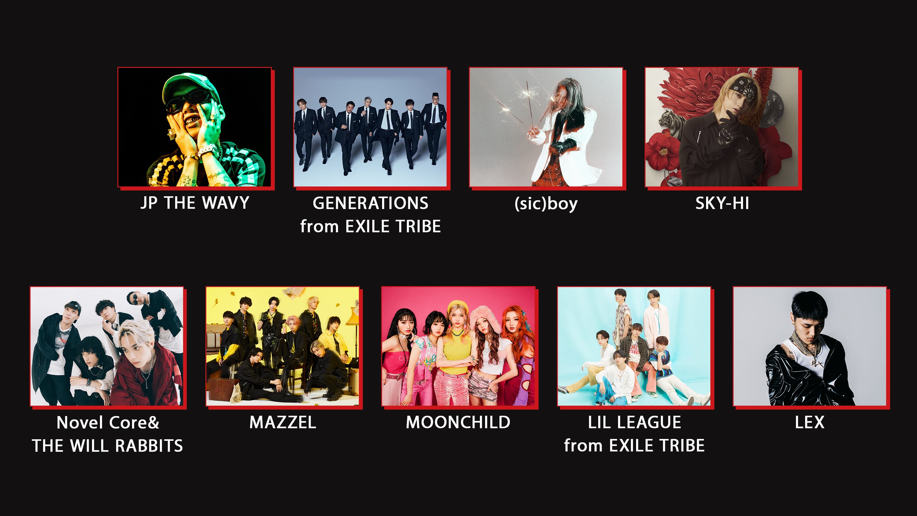 出演は、JP THE WAVY、GENERATIONS from EXILE TRIBE、(sic)boy、SKY-HI、Novel Core&THE WILL RABBITS、MAZZEL、MOONCHILD、LIL LEAGUE from EXILE TRIBE、LEXの9組。今の音楽シーンを彩る豪華アーティストによる、一夜限りのスペシャルライブをぜひリアルタイムでお楽しみいただきたい。