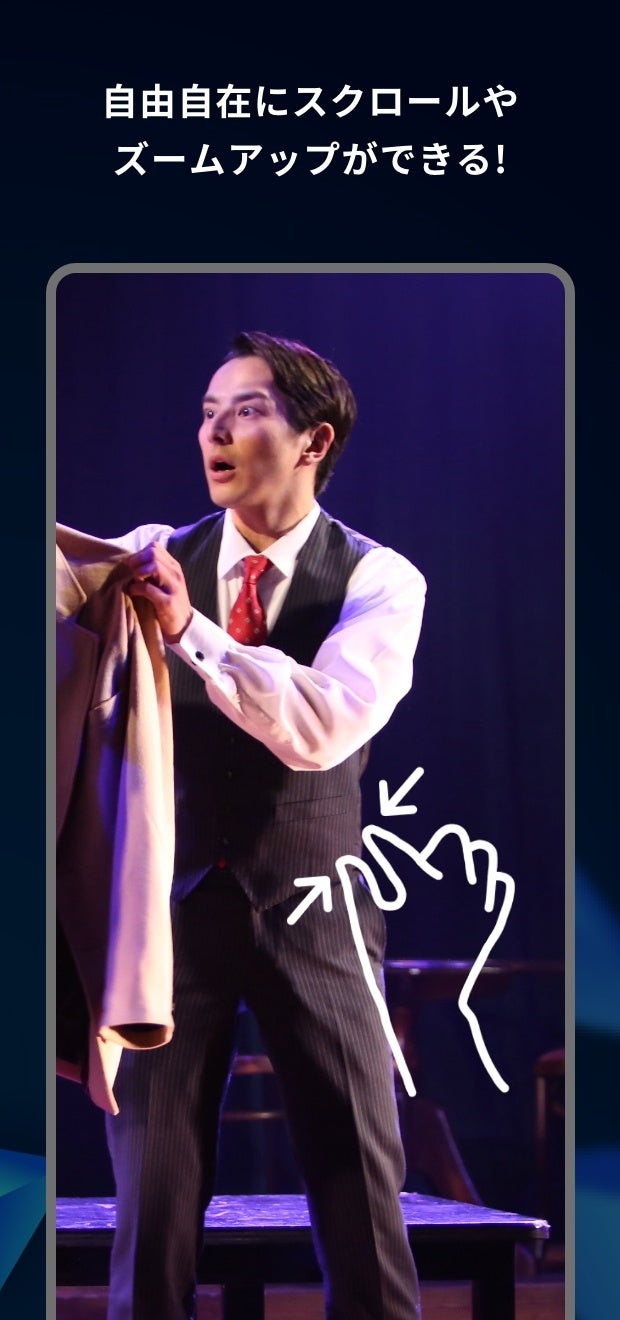 画面のスクロールで観たい画角にフォーカスし、さらにズームアップ/ズームアウトして自分好みに観劇ができます。演劇配信アプリとしては業界初の機能です。