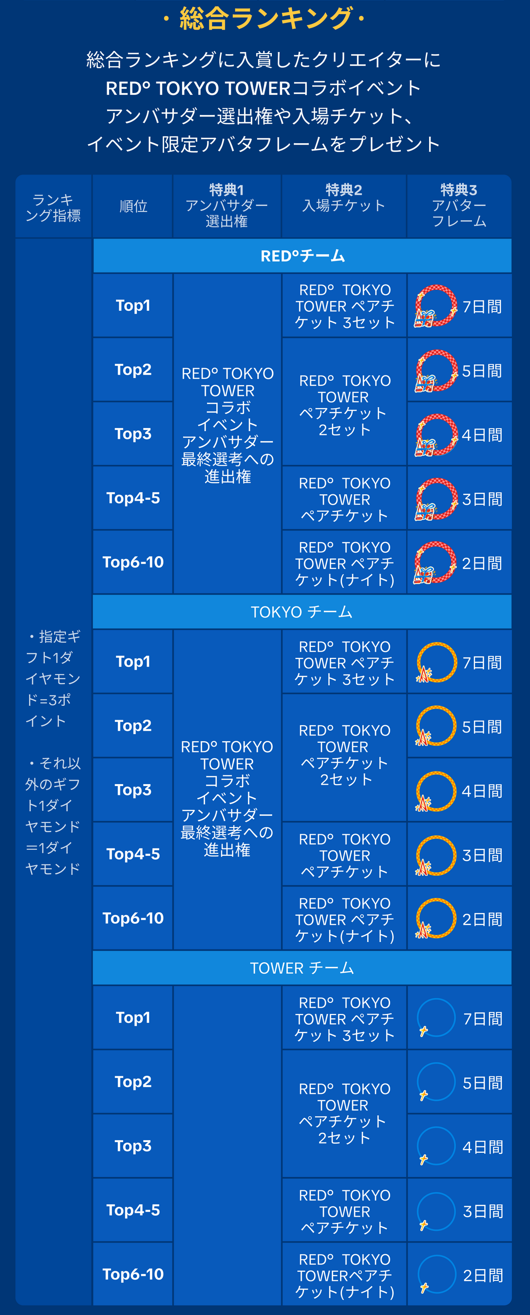 本イベントでは視聴者・配信者向けにデイリーミッション、配信者向けデイリー・総合ランキングが同時開催されます。以下のポイントを合算の上、各グループの総合ランキング上位10名の配信者は『TikTok LIVE | RED° TOKYO TOWER』アンバサダーの最終選考へ進出できる権利を贈呈いたします。