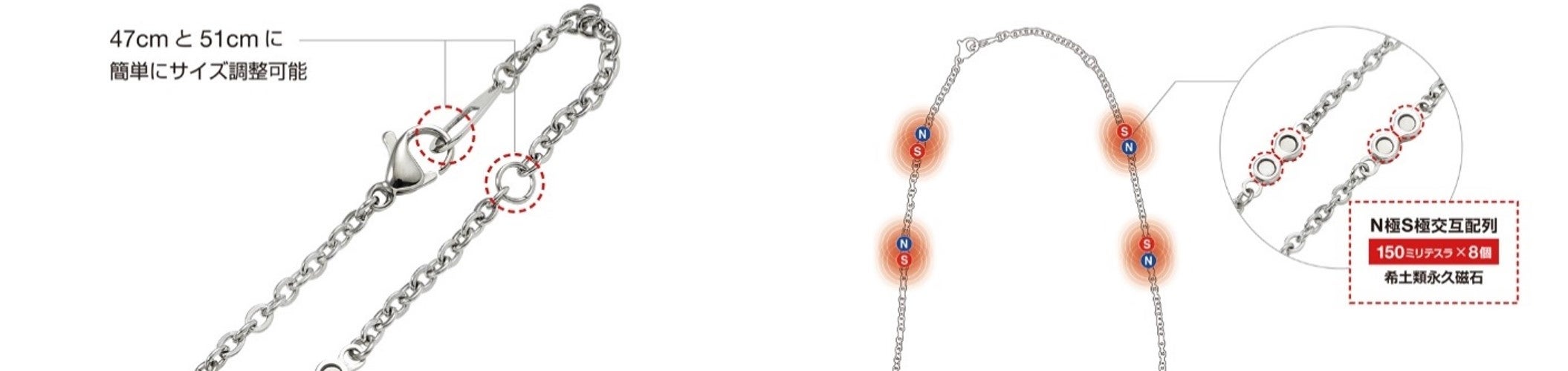 ■肌に優しい上質のステンレス(SUS316L)のチェーンに150ミリテスラ (※) ×8個の希土類永久磁石を内蔵。独自のN極S極交互配列で磁力が広範囲に影響し、首・肩の血行を改善、筋肉のコリを緩和します。