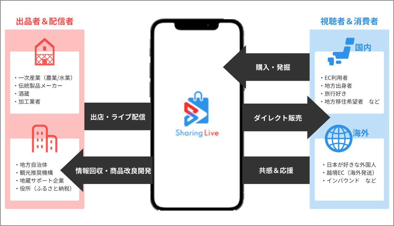 ライブコマースを通して、地方のイイモノを「発掘」「応援」「共有」することを目的とし、日本各地の商品を紹介しています。SharingLiveが実現したいのは、地場産業の先にある「人と人とのつながり」の見える化です。