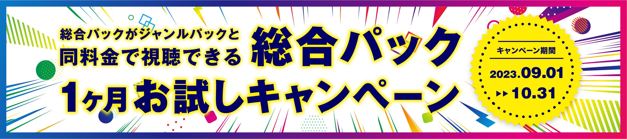 *キャンペーン適用には、期間中に総合パックをご契約されたお客様が対象です。9月もしくは10月にご契約された月の1ヵ月分の料金が対象となります。また、既にジャンルパックを契約されているお客様はご自身でジャンルパックから総合パックへの契約変更が必要です。翌月以降、ジャンルパックへ変更する場合は、お客さま自身での変更手続きが必要です。