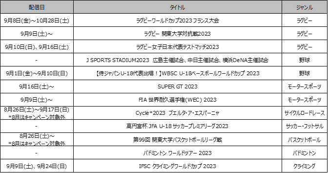 キャンペーン期間中には、「ラグビーワールドカップ2023 フランス大会」、「Cycle*2023 ブエルタ・ア・エスパーニャ」、「SUPER GT 2023」、「広島東洋カープ、横浜DeNAベイスターズ、中日ドラゴンズ主催試合*** 」など、J SPORTSのおすすめコンテンツが盛りだくさん。この機会にこれまで観戦経験の少ないスポーツジャンルをご覧になってみてはいかがでしょうか?