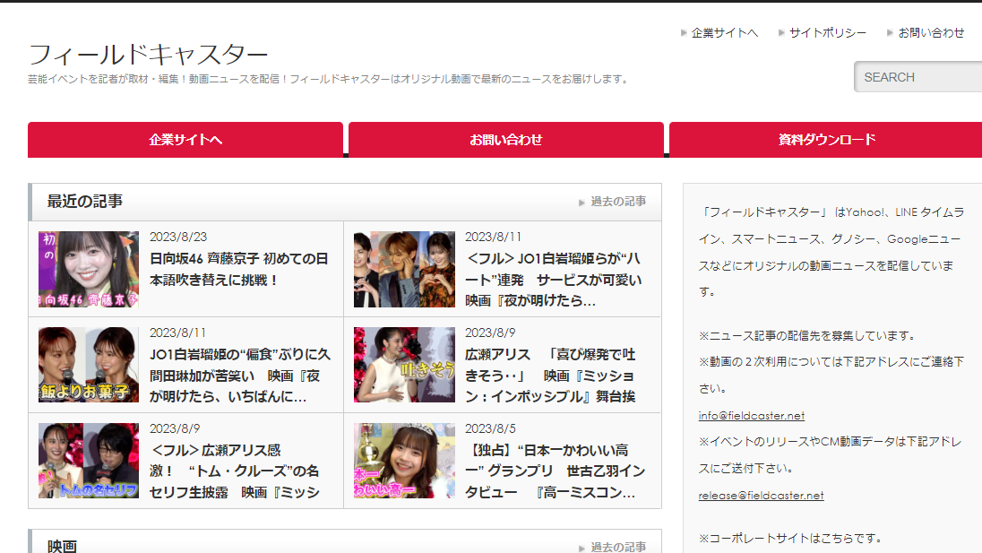 メディアしか入れない芸能イベントやCM撮影の舞台裏など、独自に取材・編集した動画ニュースを主要ポータルサイト(※)やYouTubeなどで配信するニュース動画メディア。