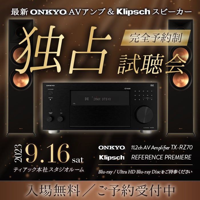 理想的な視聴空間を実現するDirac Liveを搭載した11.2ch AVアンプONKYO『TX-RZ70』と70年の歴史を誇るアメリカのスピーカーブランド『Klipsch』の『REFERENCE PREMIERE』シリーズでご自身お気に入りのBlu-ray / Ultra HD Blu-ray Discを楽しんで頂くイベントです。