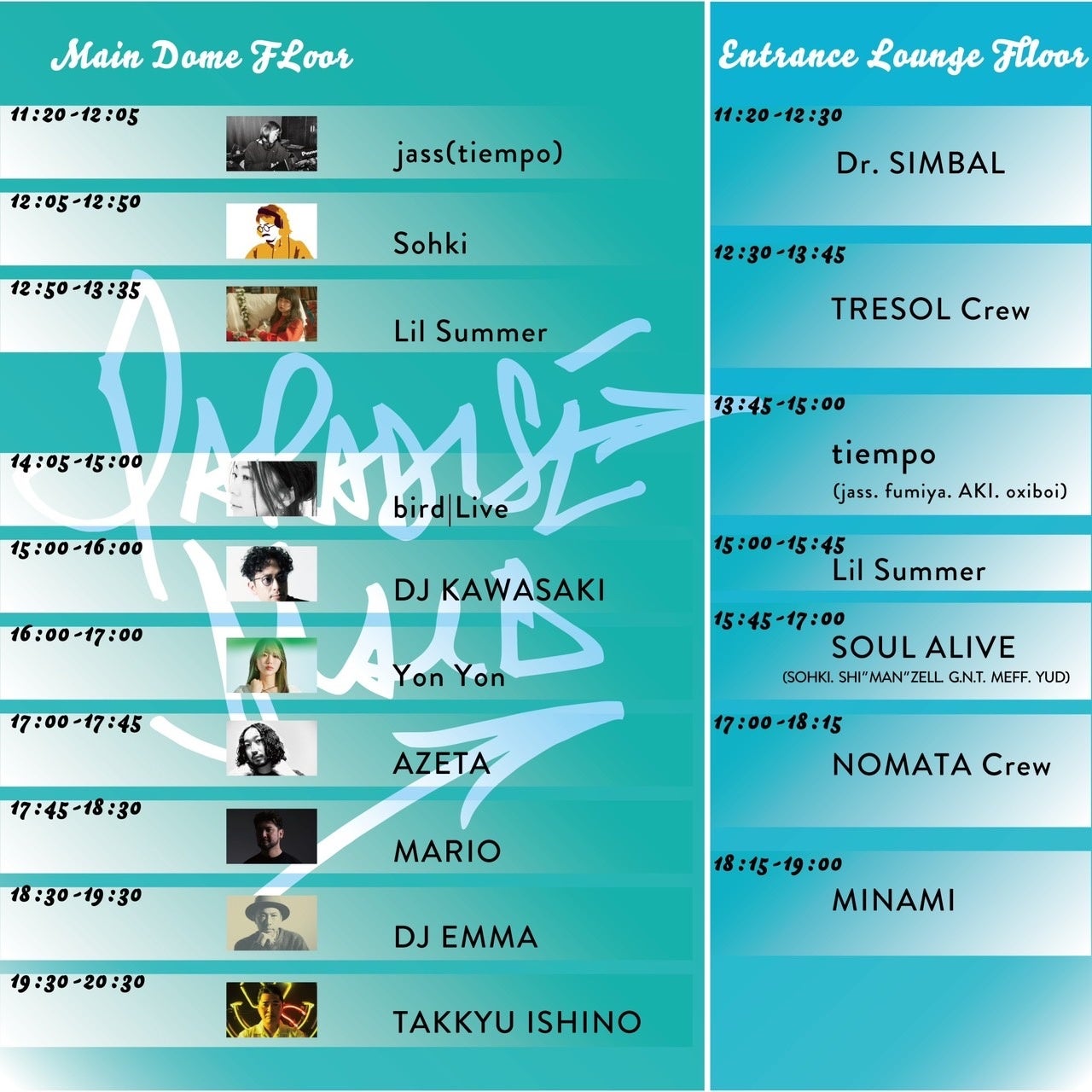 出演アーティストは、DJの「 TAKKYU ISHINO」「 DJ EMMA」「 DJ KAWASAKI」「 YonYon」をはじめ、 「bird」のアコースティックライブも予定。また、フードブースでは福岡市内の飲食店を中心に14店舗が野外フェスを盛り上げるフード&ドリンクを用意しています。