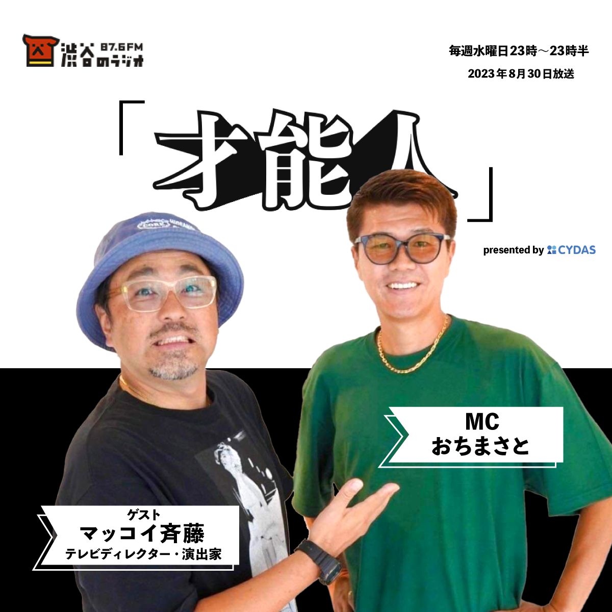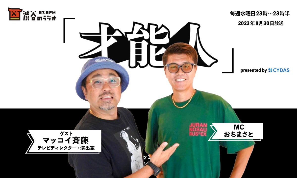 おちまさとのラジオ番組『才能人』(渋谷のラジオ 87.6MHz 毎週水曜日 午後11時~)。8月30日放送のゲストは、テレビディレクター、演出家、テレビプロデューサーとして、数々の人気番組を手掛けてきたマッコイ斉藤。小学生時代からお笑いが好きだったというマッコイ斉藤は、どのようにして人気テレビ番組のディレクターとなって行ったのか。30年来の仲でありながら、公の場でのトークは初めてという二人の会話は弾み、数々の裏話が飛び出します。