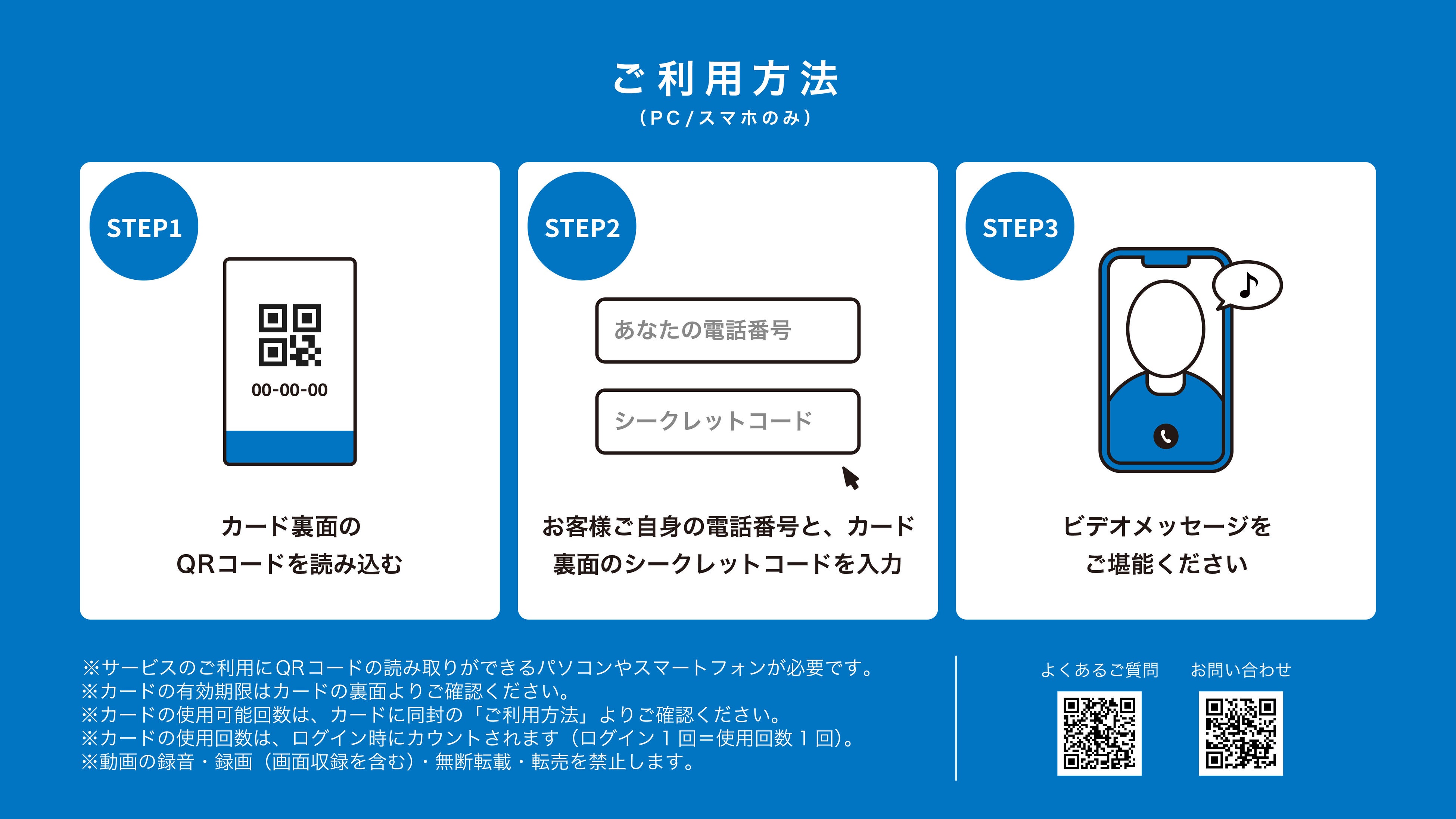 これまでの音声のみの体験に比べ、推しと画面越しに会話をしているようなよりスペシャルな疑似体験を提供可能です。利用方法は簡単で、カード裏のQRコードを読み込み、電話番号とシークレットコードを入力するだけでご利用いただけます。