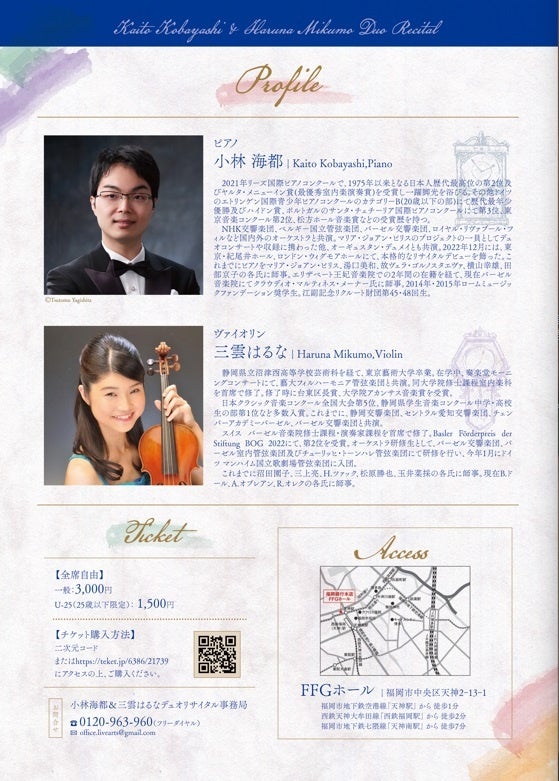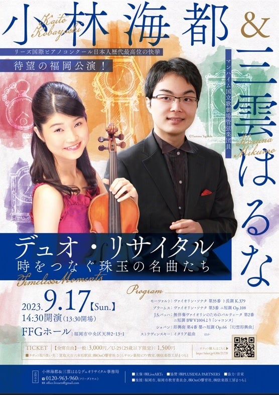 株式会社LiveARTs(本社:福岡市中央区、代表:森 善虎)は、2023年9月17日(日)14時半~16時半まで、福岡市天神のFFGホール(692席)にてクラシック音楽のコンサート「小林海都&三雲はるな デュオ・リサイタル」を開催いたします。