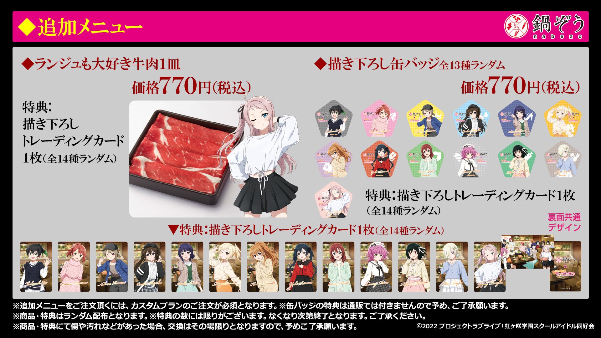 鍋ぞうニジガクカスタムプランを注文すると、各学年をイメージしたコラボドリンクが付いてくるほか、描き下ろしイラストを使用した各ノベルティをプレゼント!追加メニューもあるのでお忘れなく!