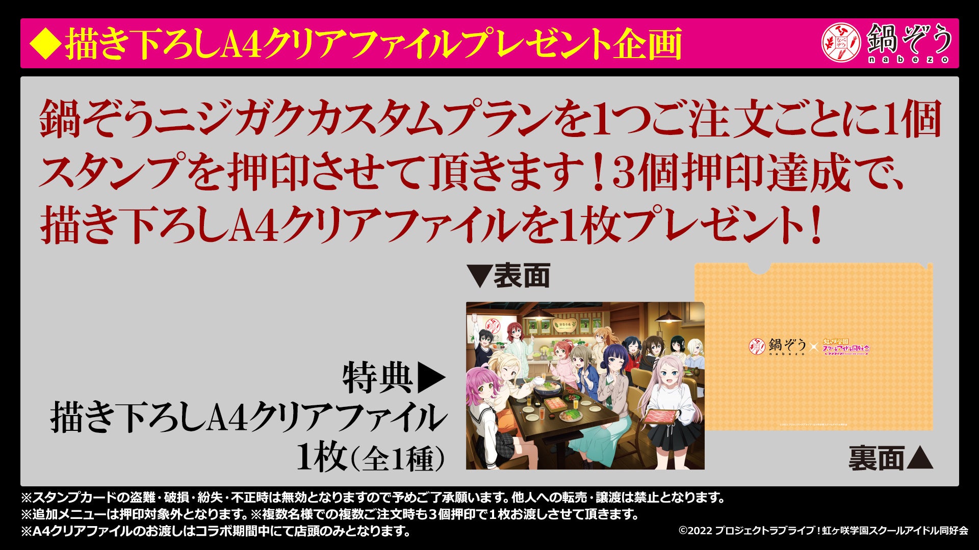 鍋ぞうニジガクカスタムプランを1つご注文ごとに1個スタンプを押印します!3個押印達成で描き下ろしA4クリアファイルを1枚プレゼント!