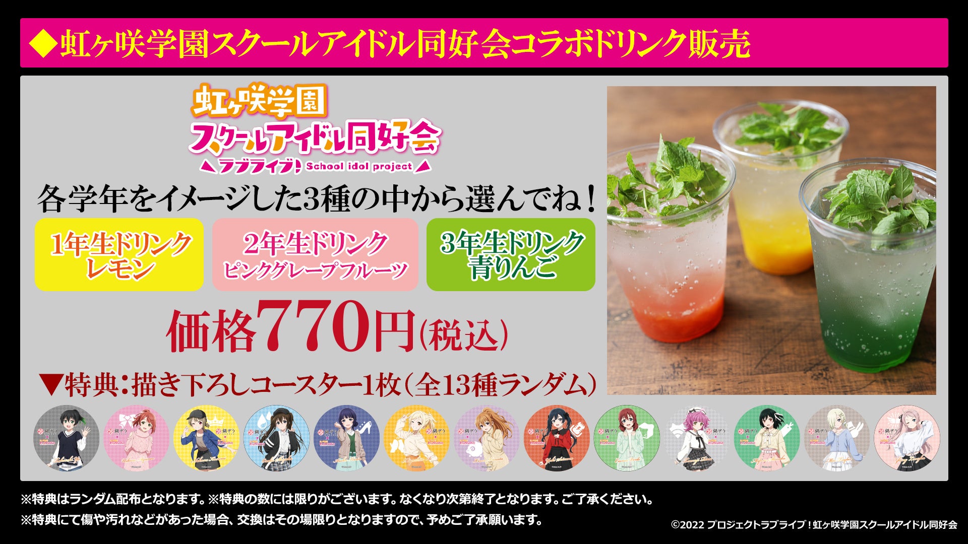 ドリンク種類:虹ヶ咲学園スクールアイドル同好会ドリンク1杯(全3種:1年生/2年生/3年生)