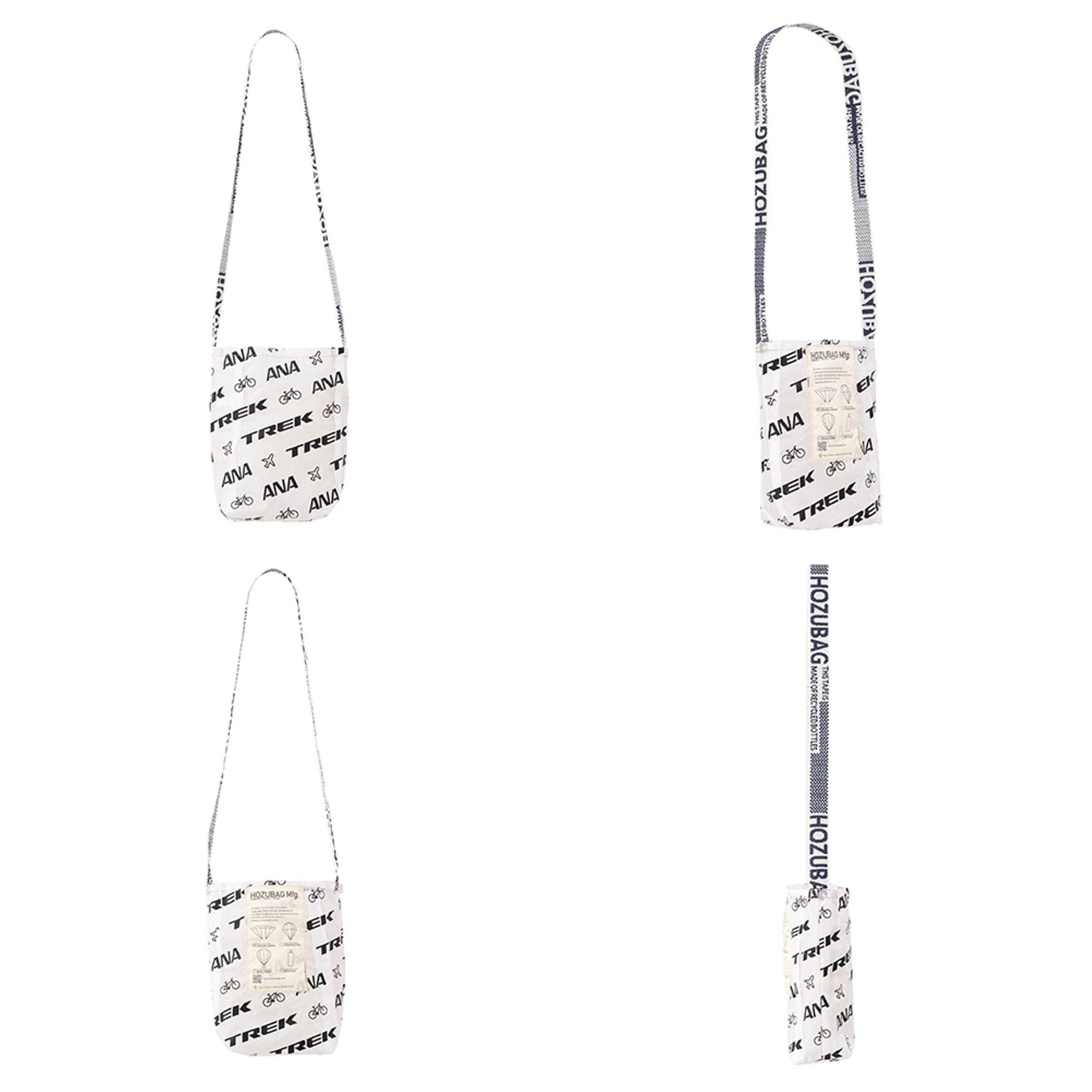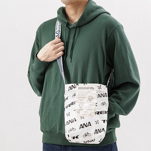 第1弾は朝日放送グループホールディングス株式会社が包括連携協定を結んでいる京都府亀岡市と繋ぎ合わせ、同市を拠点に活動している「HOZUBAG」に注目。ユーズドパラグライダーを回収、解体し、バッグに作り変えることで地上資源として循環させているブランドで、シグネチャーアイテムの一つであるサコッシュにTREK×ANAのロゴマークを冠し、日頃のサイクリングやショッピング、旅行などにご利用頂ける商品となっています。