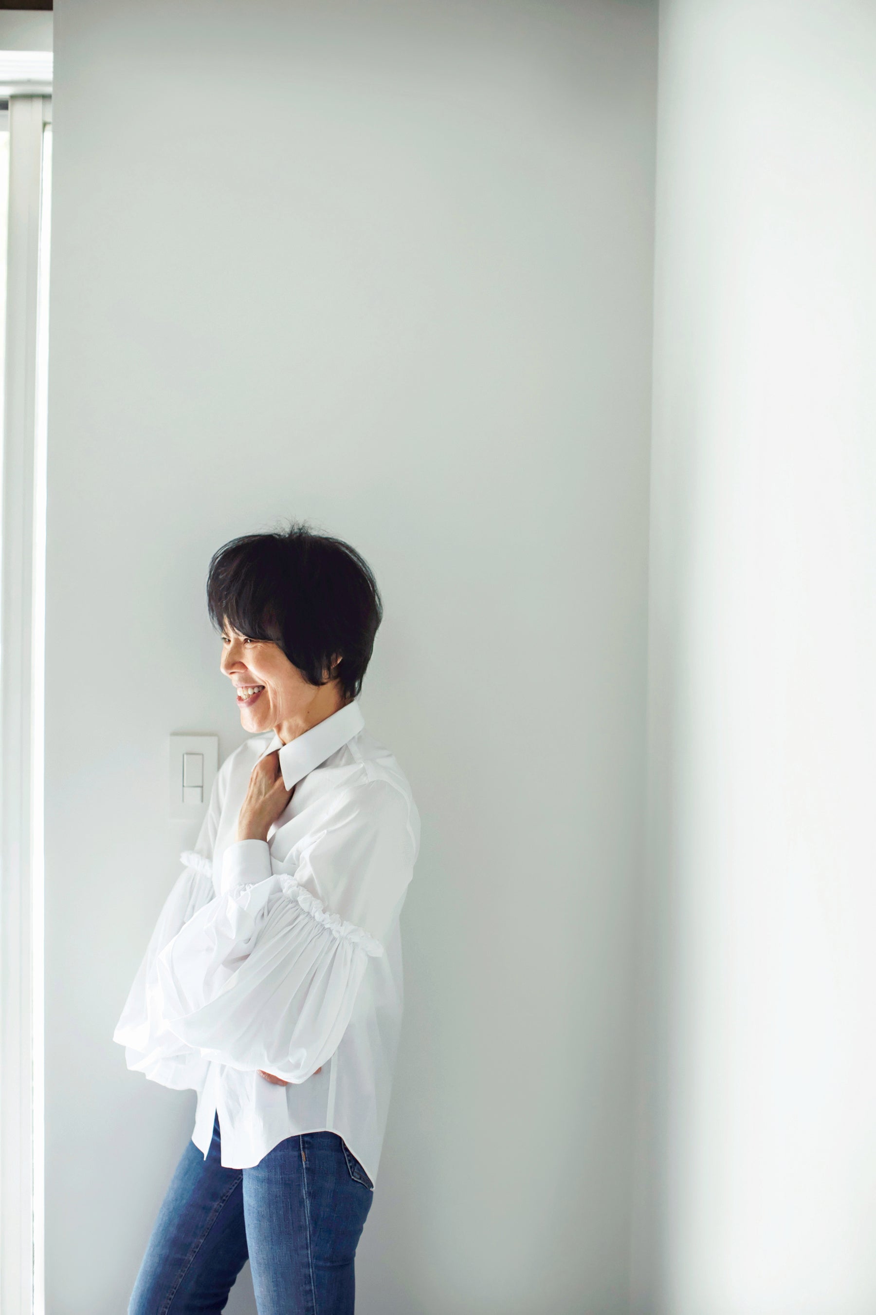 何枚持っているかわからない、大好きな白のブラウス。カジュアルにも、かしこまった場でも、栗原さんらしい着こなし。