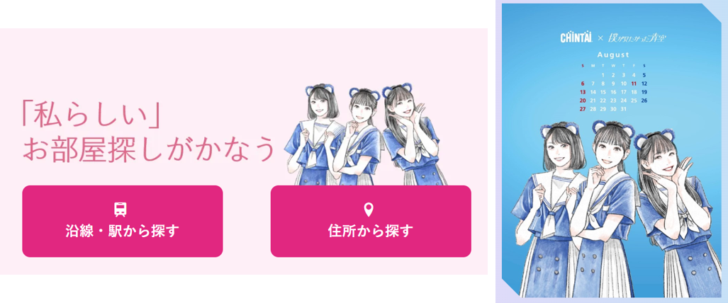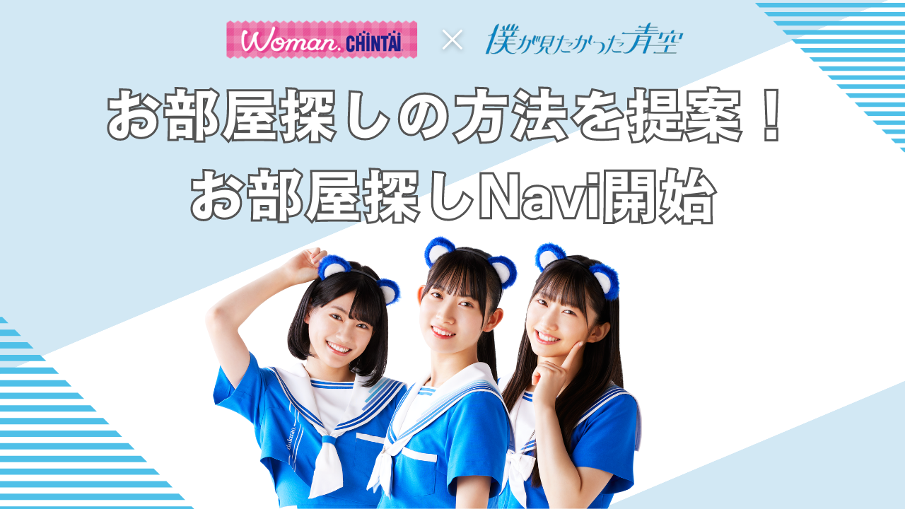 今回、CHINTAIの新イメージキャラクターに「僕が見たかった青空」が就任したことを記念して、メンバーからの質問にWEB上で答えるだけで自分にピッタリのお部屋探しの方法が見つかる「お部屋探しNavi」をWoman.CHINTAI内にリリースいたしました。どうやってお部屋を探せばいいのか分からない!と、お部屋探しにお困りの方は、ぜひご活用ください。