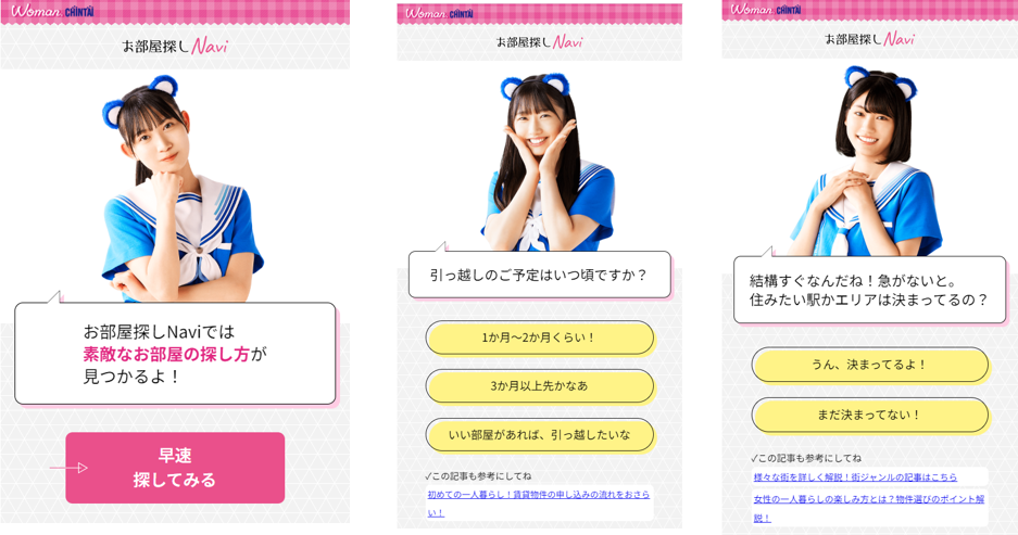 Woman.CHINTAIとは、女性のお部屋探しに特化した一人暮らしの女性が安心してお部屋を探せる賃貸物件検索サイトです。「あなたのタイプに合わせたお部屋探し診断」「一人暮らしの女性におすすめのポイント」「簡単4STEPで自分に合った家賃を診断できる」など、楽しく自分にピッタリのお部屋を見つけることができます。また、Woman.CHINTAIが運用するInstagramアカウントでは、かわいいイラストにて街の情報やおすすめスポットを紹介する企画『#街女子プロフ』を連載中。訪れたことがない方でも、街の雰囲気をイメージしやすく、住んでみたい場所の情報を取得いただけます。