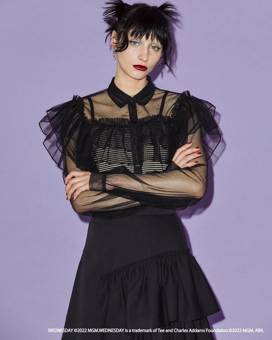 ウェンズデーがダンスシーンで着用しているドレスをイメージしたシアーブラウスはたっぷりのフリルが贅沢なアイテムです。オールブラックでまとめたウェンズデーらしいスタイリングもおすすめです。