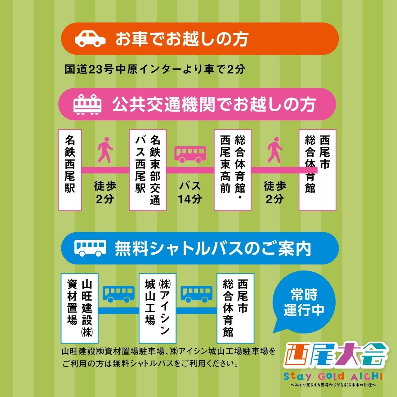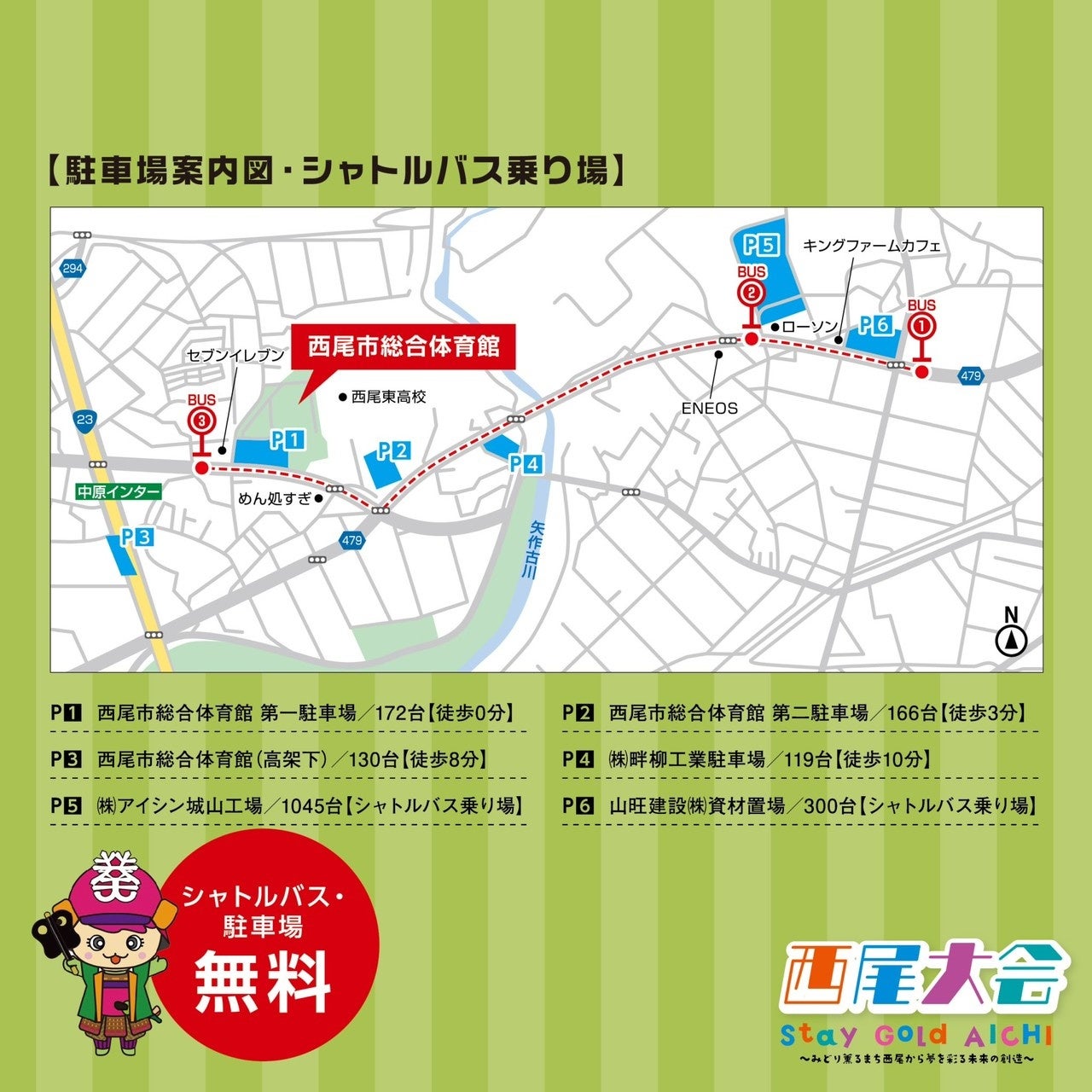(株)アイシン城山工場の駐車場、山旺建設(株)資源置き場から無料シャトルバスが常時運行しています。会場付近の駐車場に停められなかった方はそちらをご利用ください。