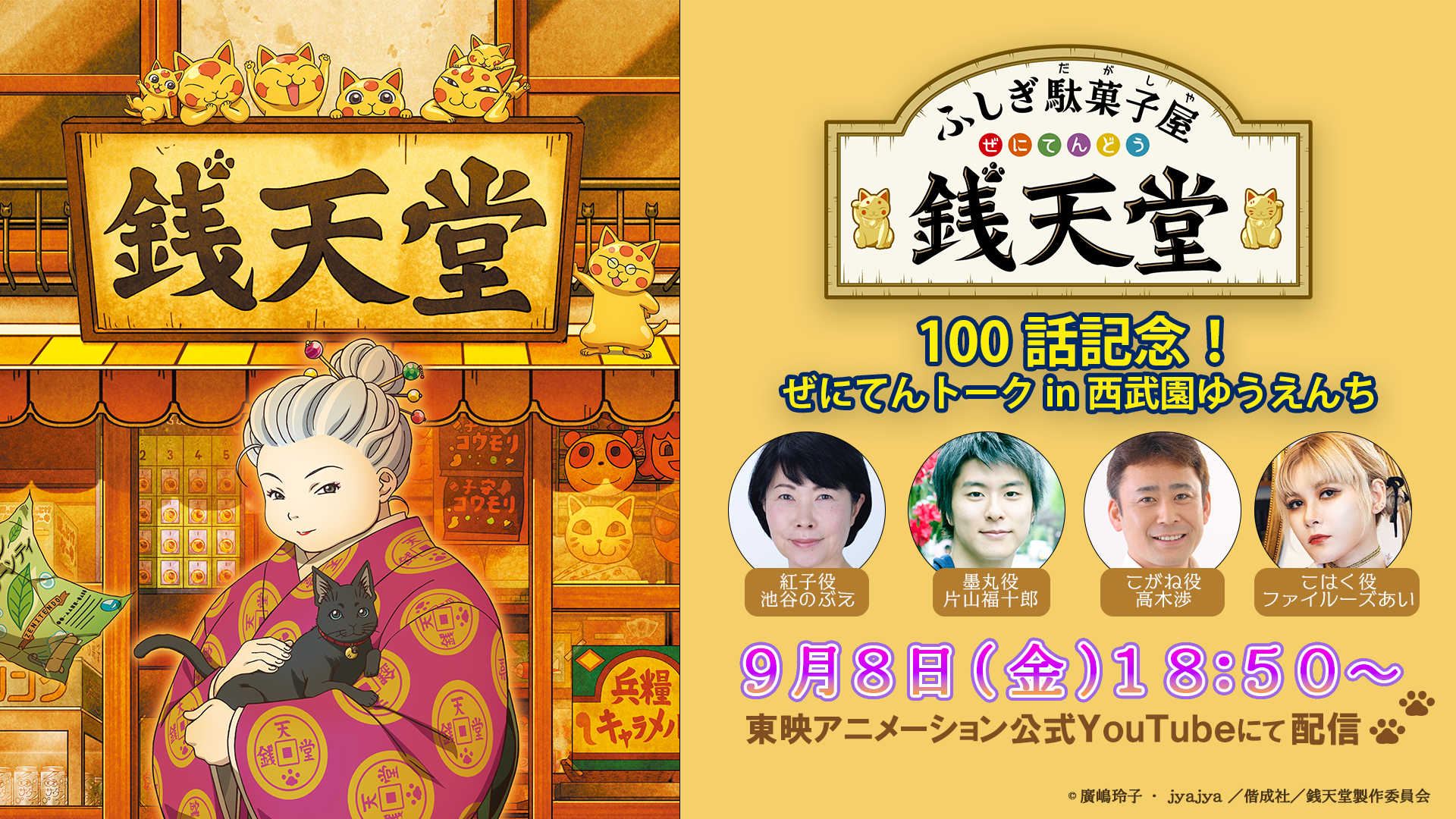 100話放送後に【アニメ「ふしぎ駄菓子 銭天堂」100話記念!ぜにてんトーク in 西武園ゆうえんち】として、銭天堂としては初のキャストが出演する特別番組をYouTubeプレミア公開します。