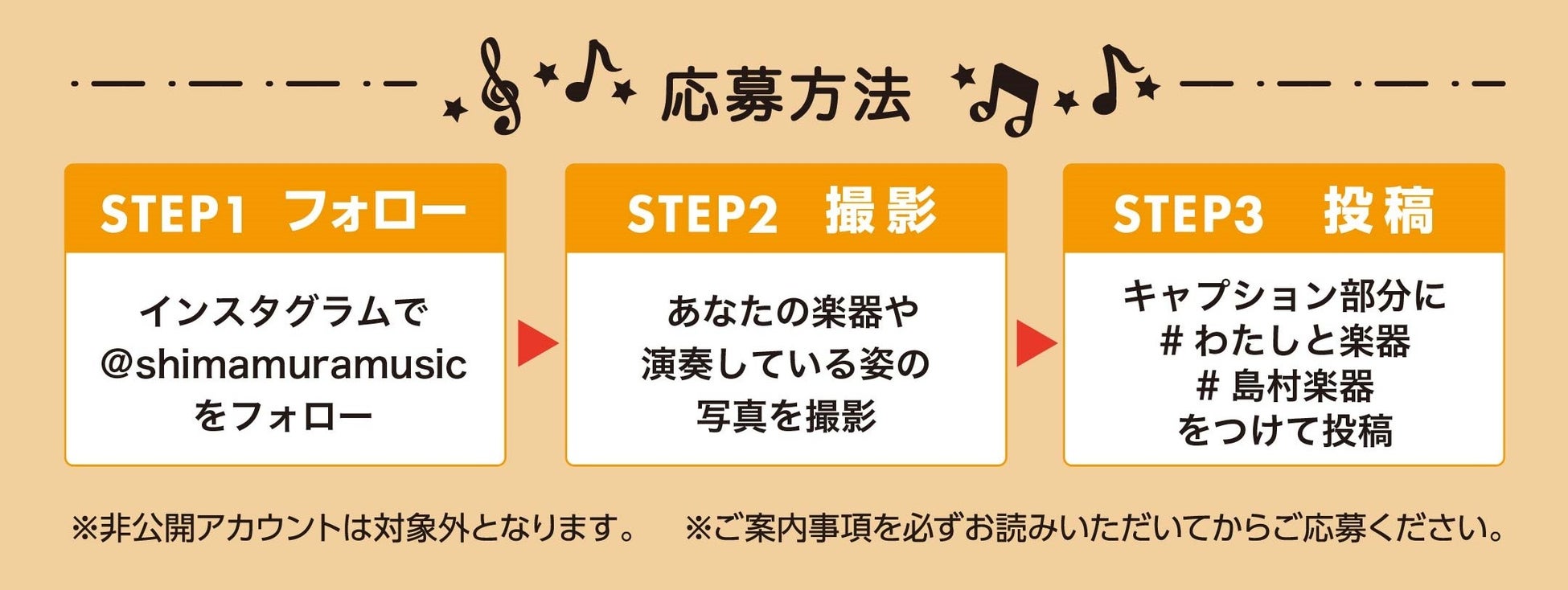 Instagramで島村楽器公式アカウントをフォローの上、「#わたしと楽器」「#島村楽器」の2つのハッシュタグをつけてご自身が愛用している楽器や演奏を楽しんでいる姿などを投稿してください。