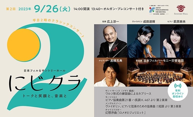 プログラムは心が弾む「にじクラ」ならではの内容で、第2回ソリストには夫婦揃ってオーケストラと共演するのはこの公演が初となるヴァイオリン:成田達輝、ピアノ:萩原麻未が登場。指揮:広上淳一とナビゲーターによる気さくなトークもお楽しみいただけます。