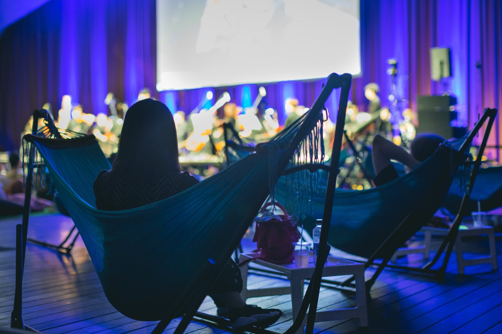 波をイメージした照明がゆらめき、今にも眠くなってしまうような会場には、リクライニングチェアやハンモック、ビーズクッションといったリラックスできる座席がずらりと広がり、通常のクラシックコンサートとは全く異なる幻想的な空間に。