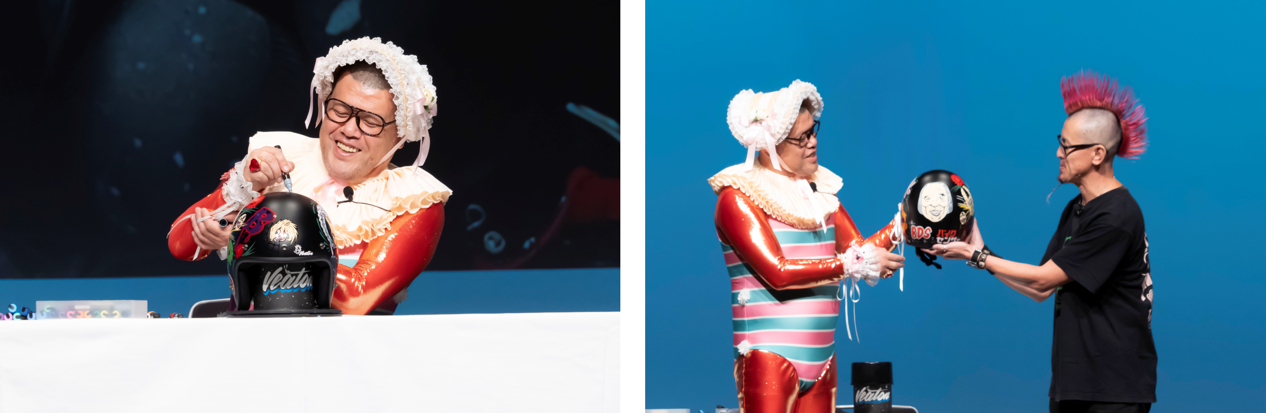当日は新CMにご出演いただいた野性爆弾 くっきー!に登壇いただき、今回お披露目した新CMに関する撮影秘話をはじめ、バイク選びにおけるこだわりなどを語っていただきました。またイベントでは、ヘルメットのカスタムペイントにも挑戦し、アーティストとしても活動している、くっきー!ならではの独特すぎる作品が完成しました。
