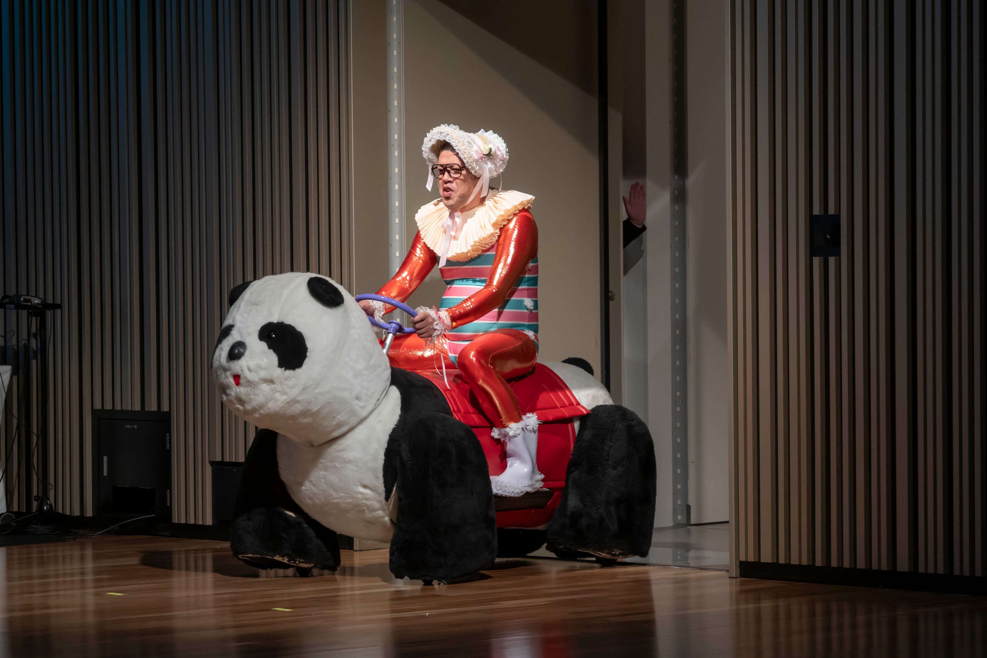 前回の発表会では、自転車で登場したくっきー!でしたが、今回は、パンダの乗り物に乗って会場に登場。存在感を放ちながら、ゆっくりと登場したくっきー!は「この歳になって、パンダの乗り物に乗るとは思ってなかった!!パンダの乗り物って思いのほか、ゆっくりなんですね。」とコメント。くっきー!ワールド全開の登場に参加者からも大きな歓声が上がりました。