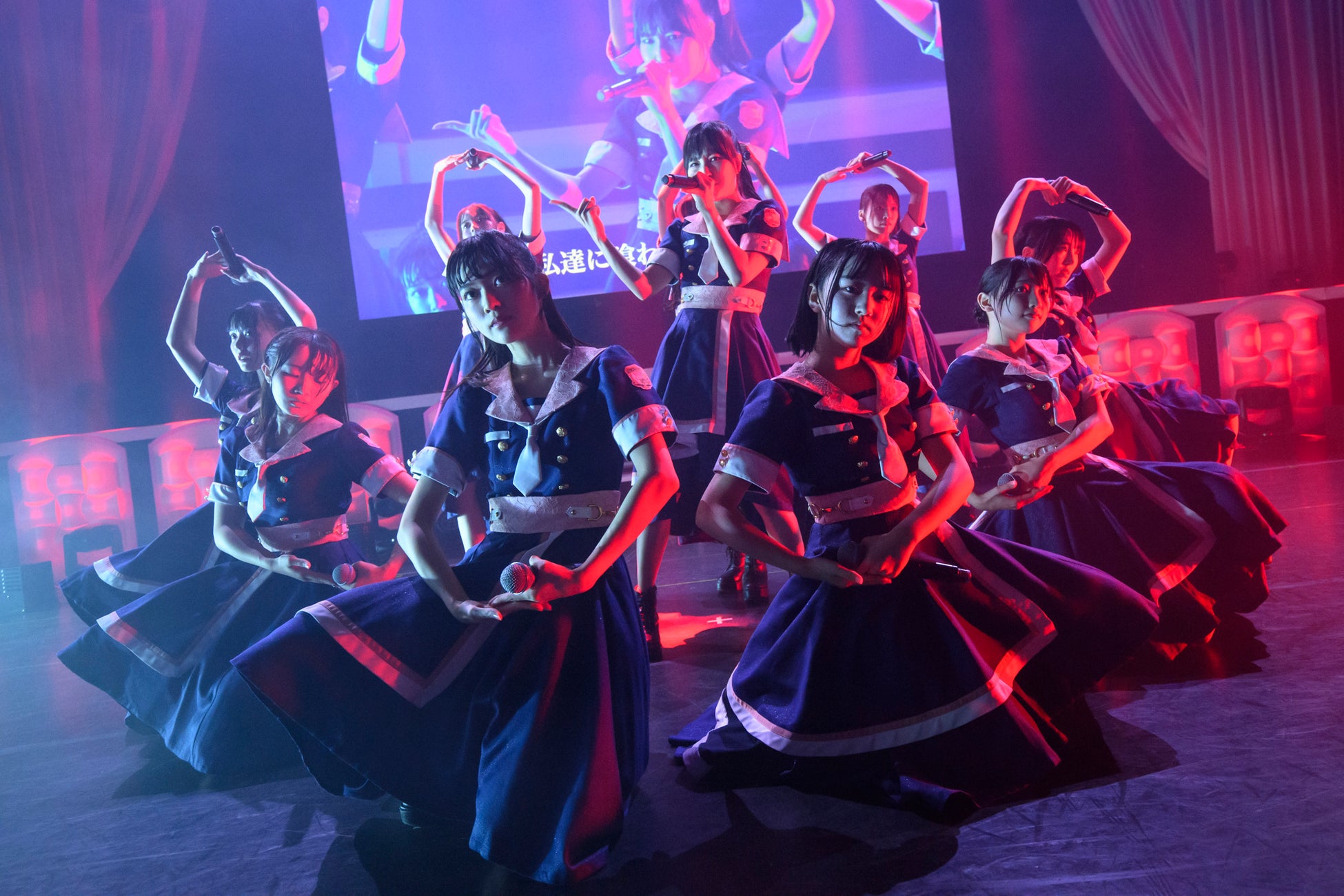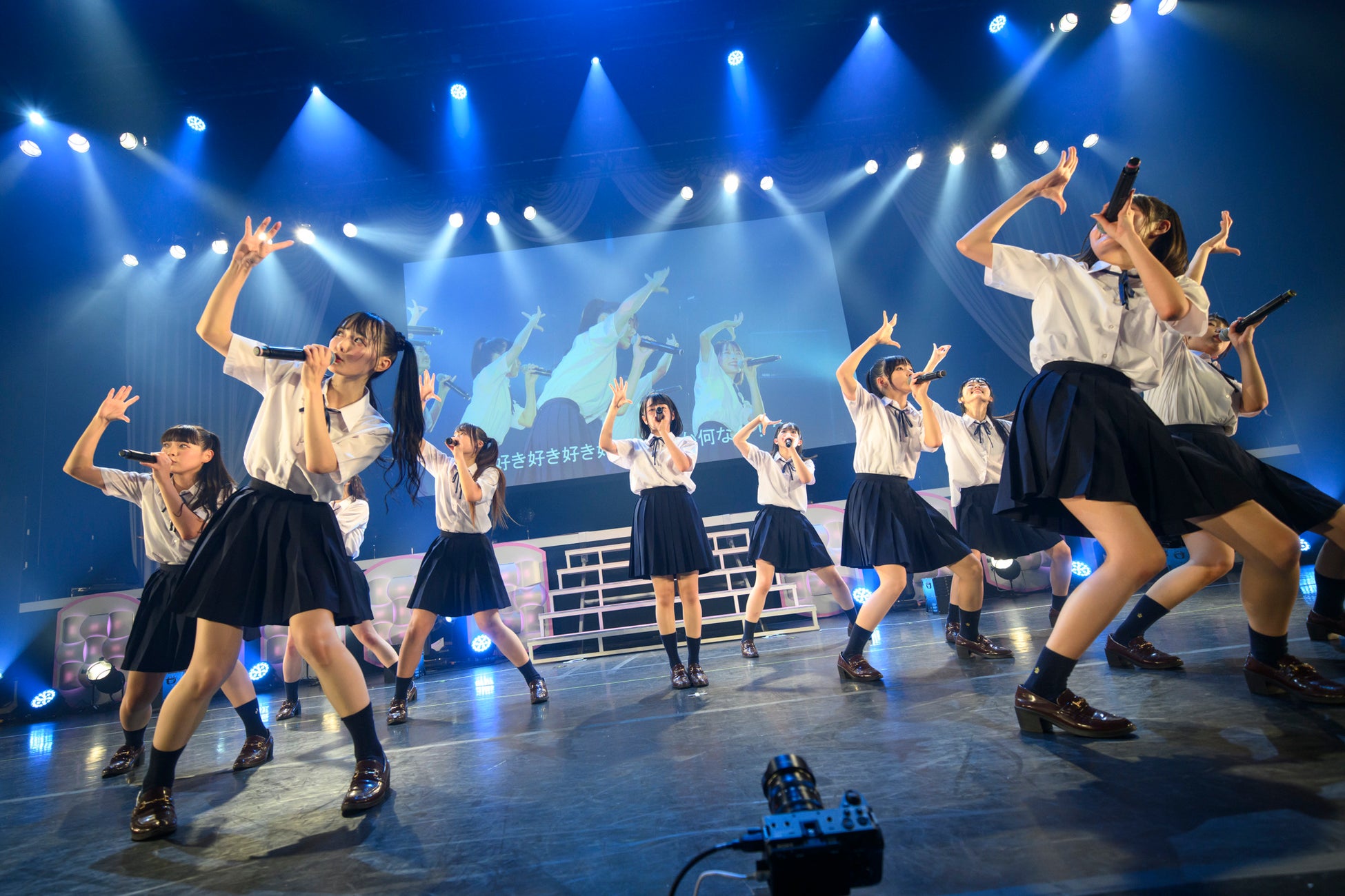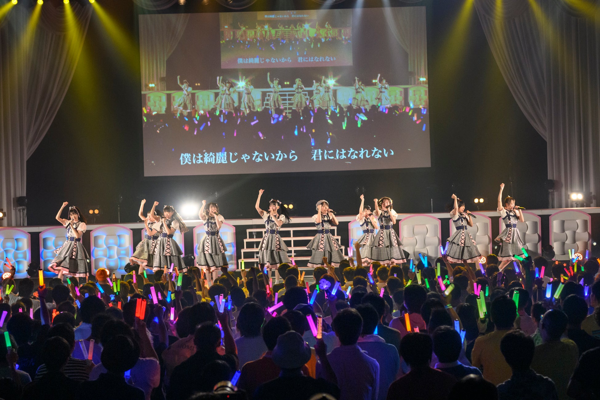 続いて正統派アイドルソングの「女の子は強い」「男の子の目的は何?」を披露すると、暗転してメンバーへのインタビュー映像が始まる。高嶺のなでしこに選ばれて人生が変わった10人それぞれの思いがファンに伝えられ、アイドルという仕事への思いをぶつけるように「僕は君になれない」のパフォーマンスがスタートし、「♯超絶かわいい」ではタオルを振って客席を煽る。ファンも「超絶かわいいたかねこ!」のコールで応えていく。