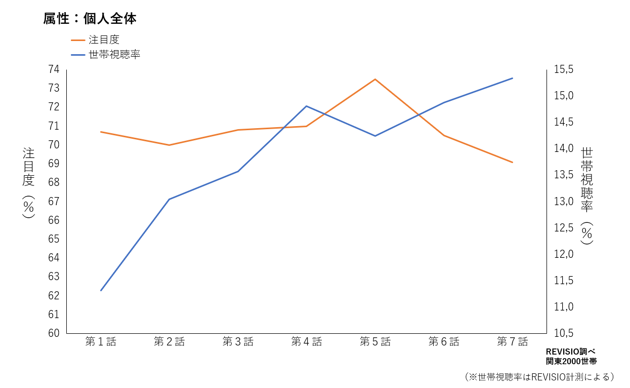 第1話から第7話までの、注目度とREVISIO計測による世帯視聴率の推移は上のグラフのようになりました。注目度が最も高かったのは第5話で73.5%、世帯視聴率が最も高かったのは第7話で15.3%でした。世帯視聴率が次第に上昇し、テレビをつけている世帯が増えているにもかかわらず、注目度も高い数値を維持していることから、テレビをつけている人は番組に惹きつけられ、注視していることがわかります。