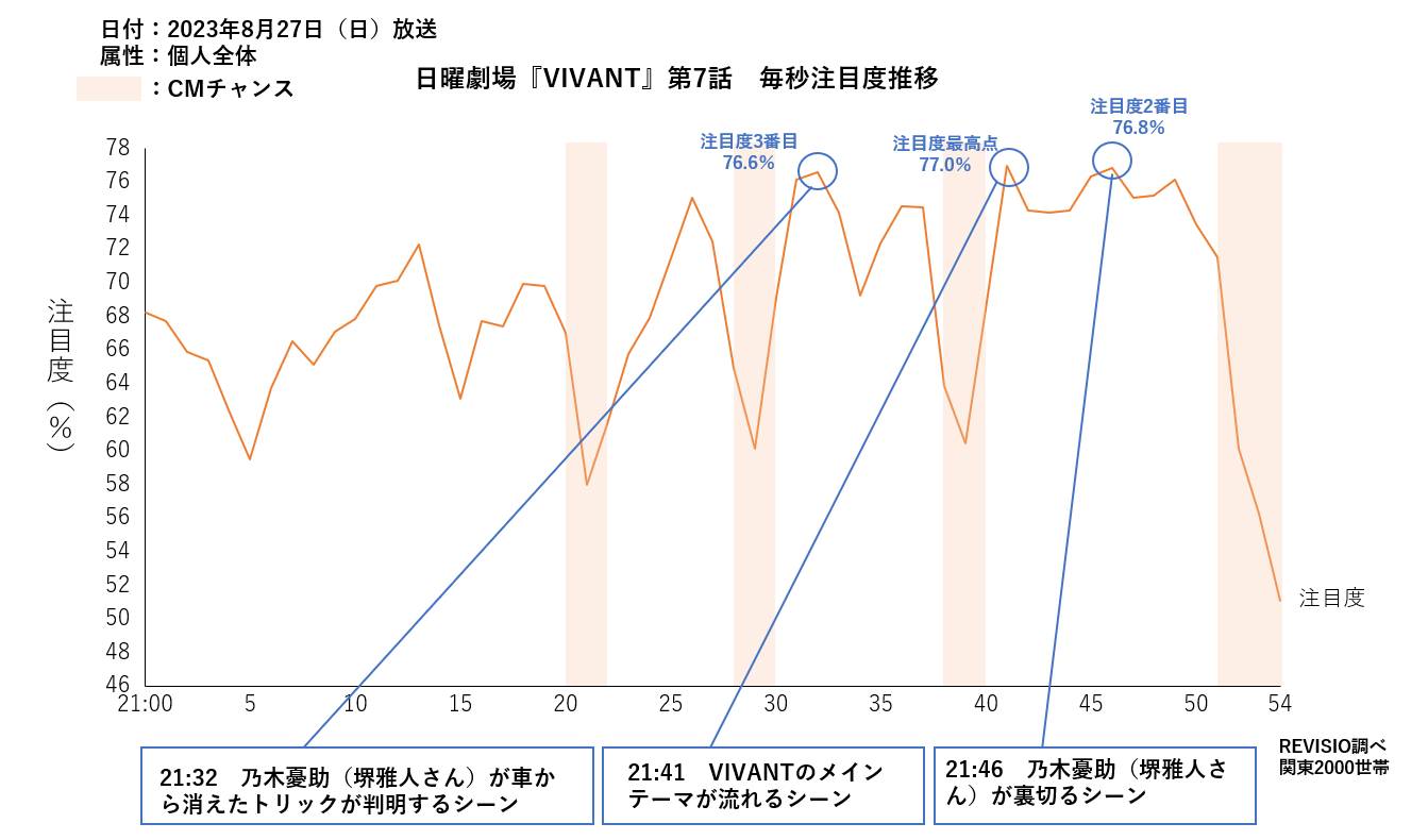 ●1番注目されたシーン 21時41分 VIVANTのメインテーマが流れるシーン 注目度:77.0%