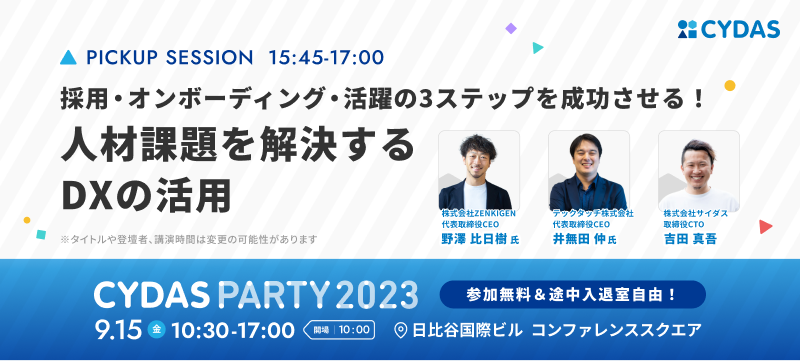 「CYDAS PARTY 2023」は、これからの人事と経営が知っておくべき最新テクノロジーの成功事例やノウハウが1日で学べる参加費無料(事前予約制)のオフラインイベントです。