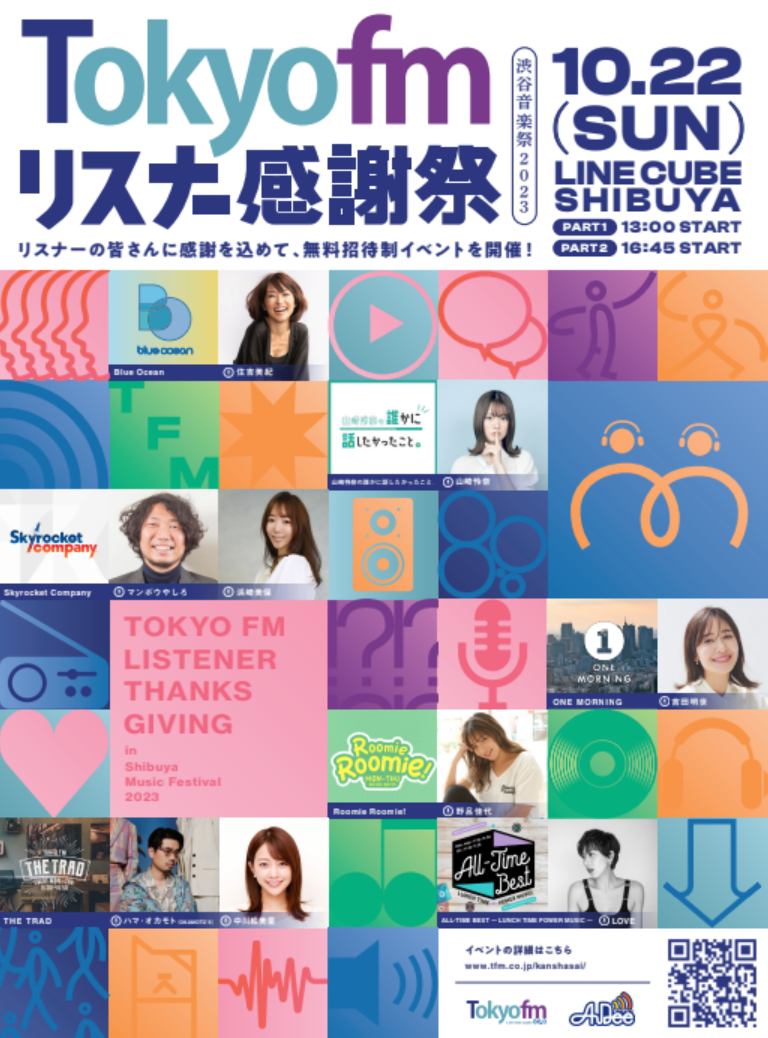 昨年4月から8期連続で聴取率全日平均「個人全体(男女12~69歳)」において首位を獲得(*ビデオリサーチ調べ)。また20代、30代をはじめ、幅広い世代から支持を得ているTOKYO FMから、リスナーの皆さんに感謝の思いを込めて、2023年10月22日(日)、『TOKYO FM リスナー感謝祭 in 渋谷音楽祭2023』を、完全無料招待制でLINE CUBE SHIBUYAにて開催します。