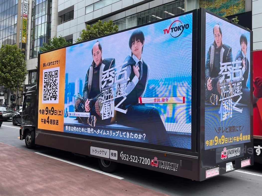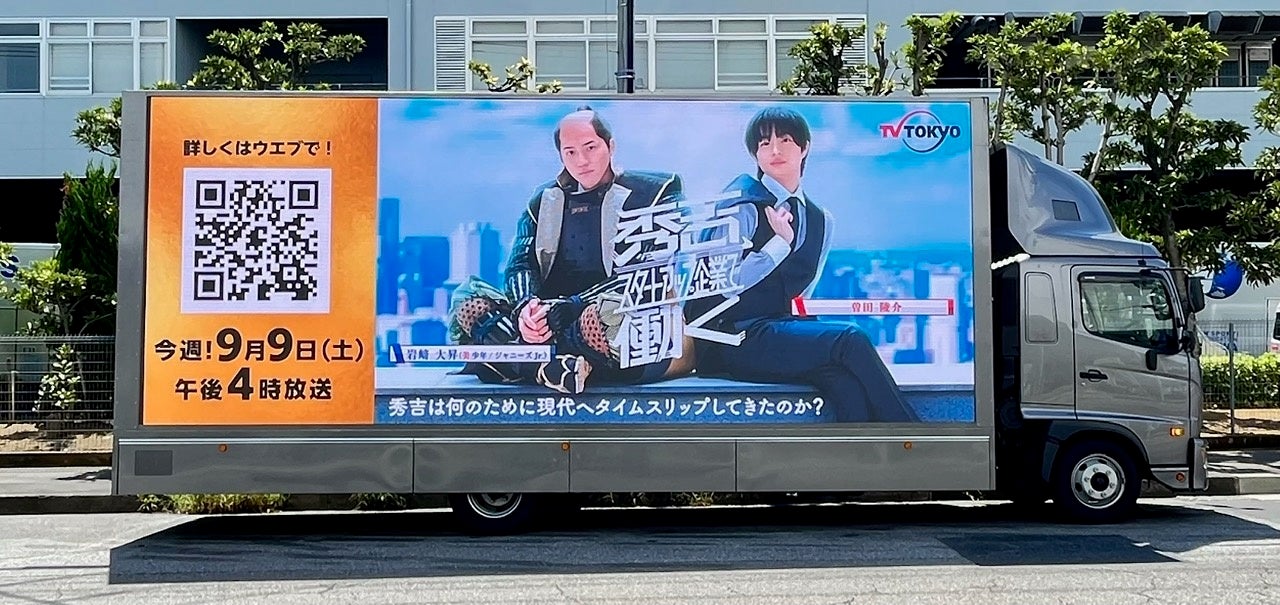 テレビ愛知は、9月9日(土)午後4時からテレビ東京系全国ネットで放送するドラマ「秀吉、スタートアップ企業で働く」の放送を記念し、東京都心での「PRトラック走行」や、3都市圏での「衣装・パネル展示」を展開しています。